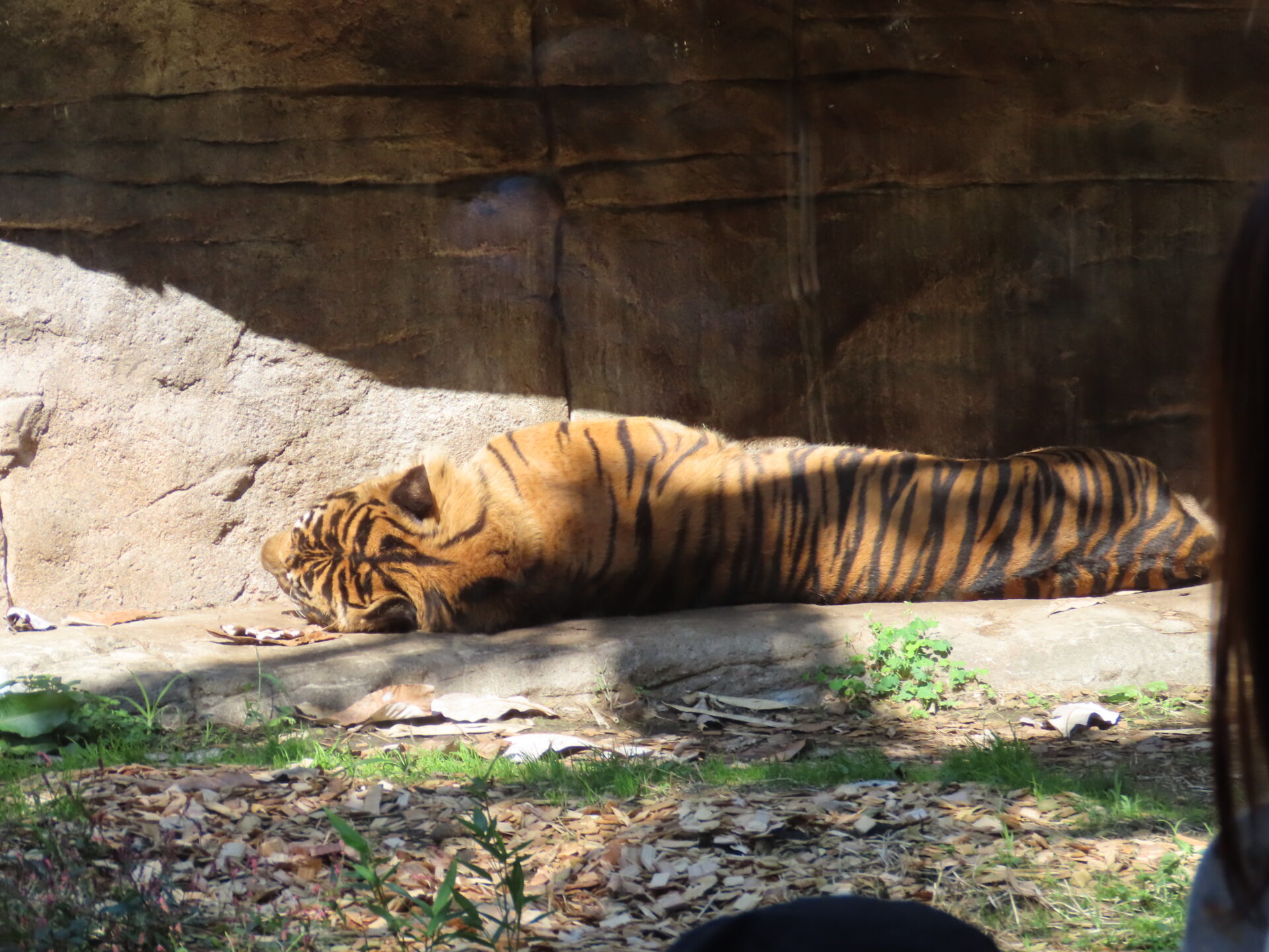 続いて見つけたのは「トラ」でした。のんびりお昼寝中のようでしたが、こどもたちは背中の模様や大きさを見て、驚いていました。