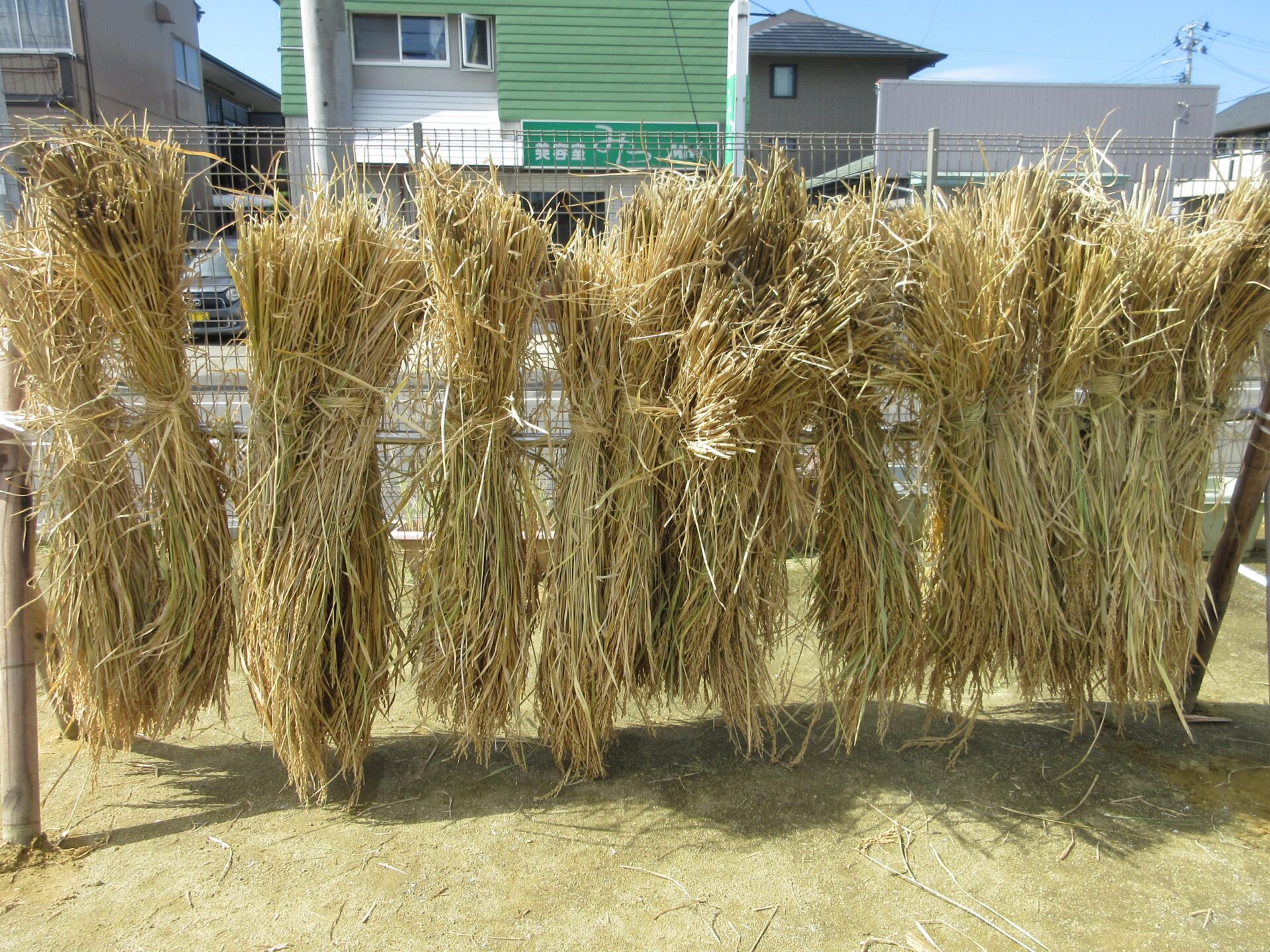 こどもたちが収穫した稲は園庭で干した後、脱穀予定です。