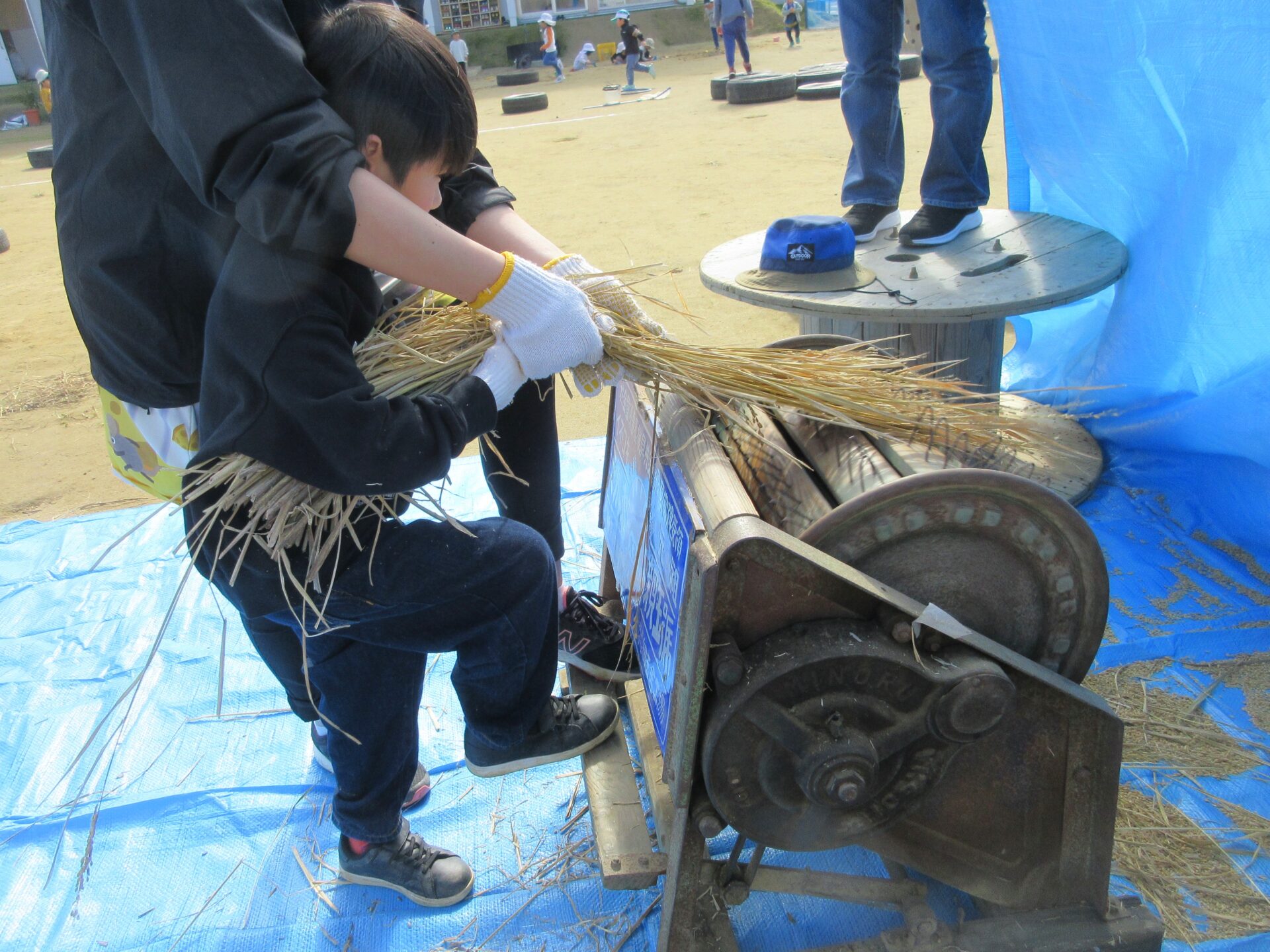 繰り返し取り組む中で、保育者もコツを掴んでいき、無事に脱穀作業は完了しました。