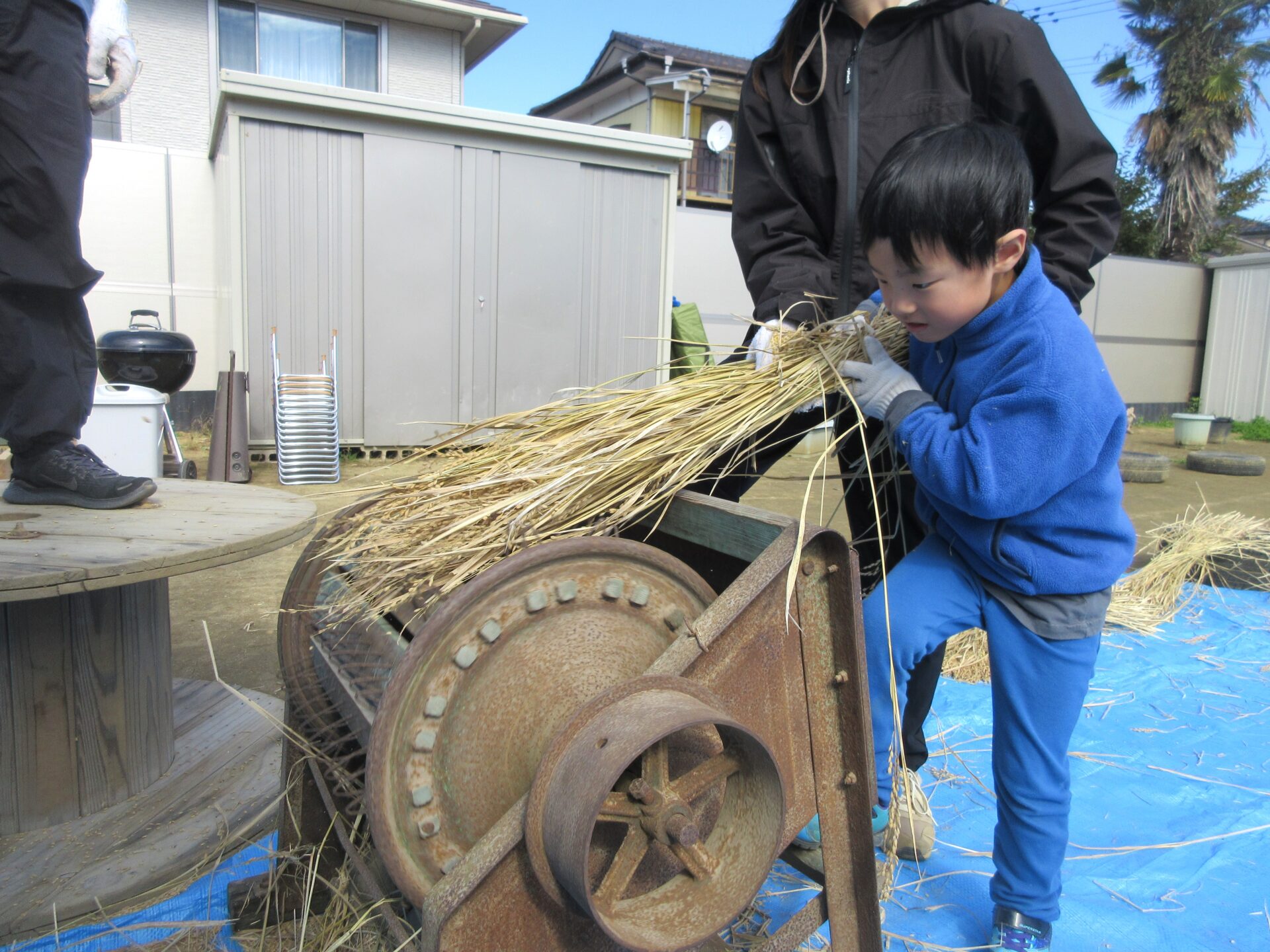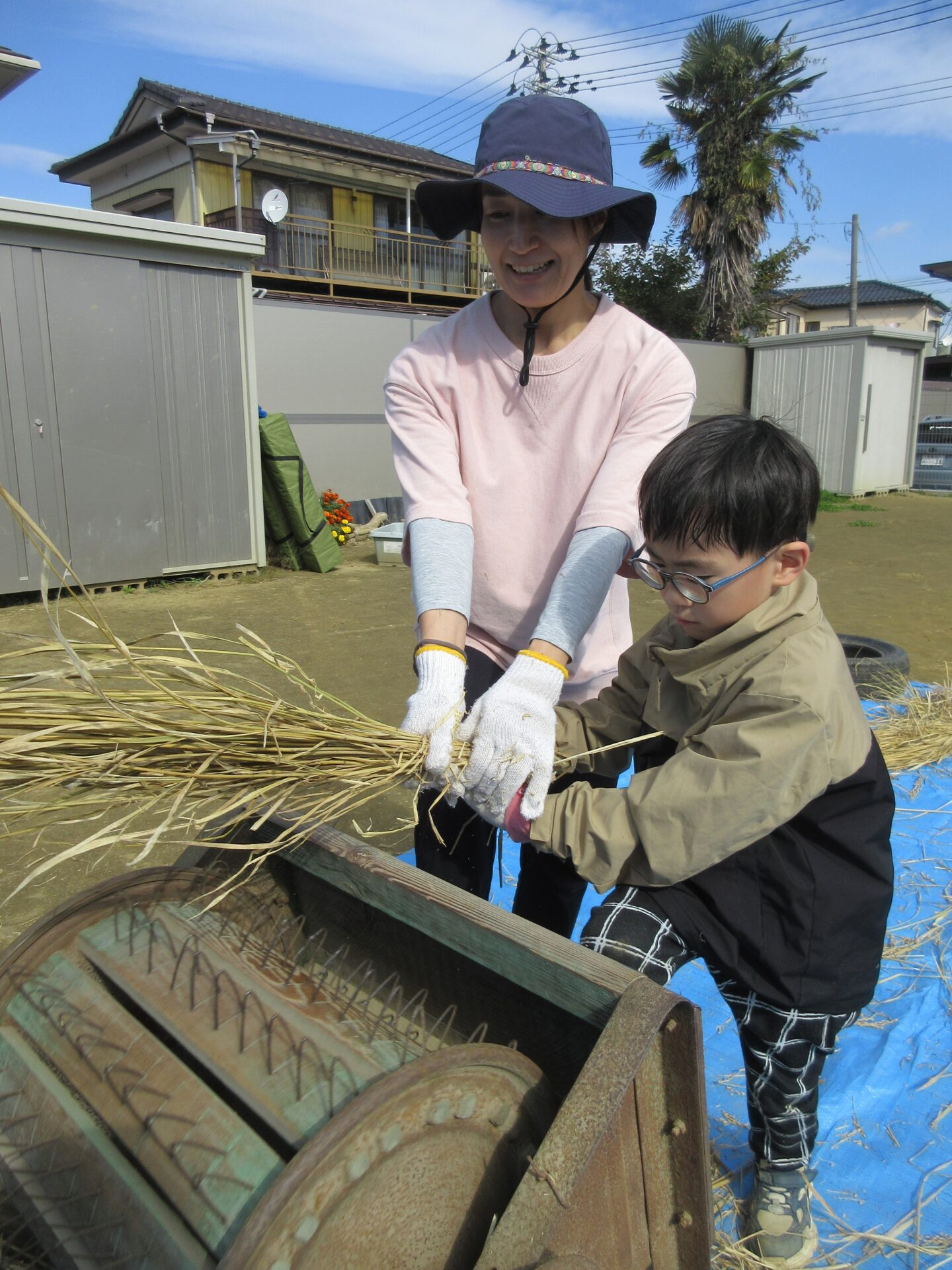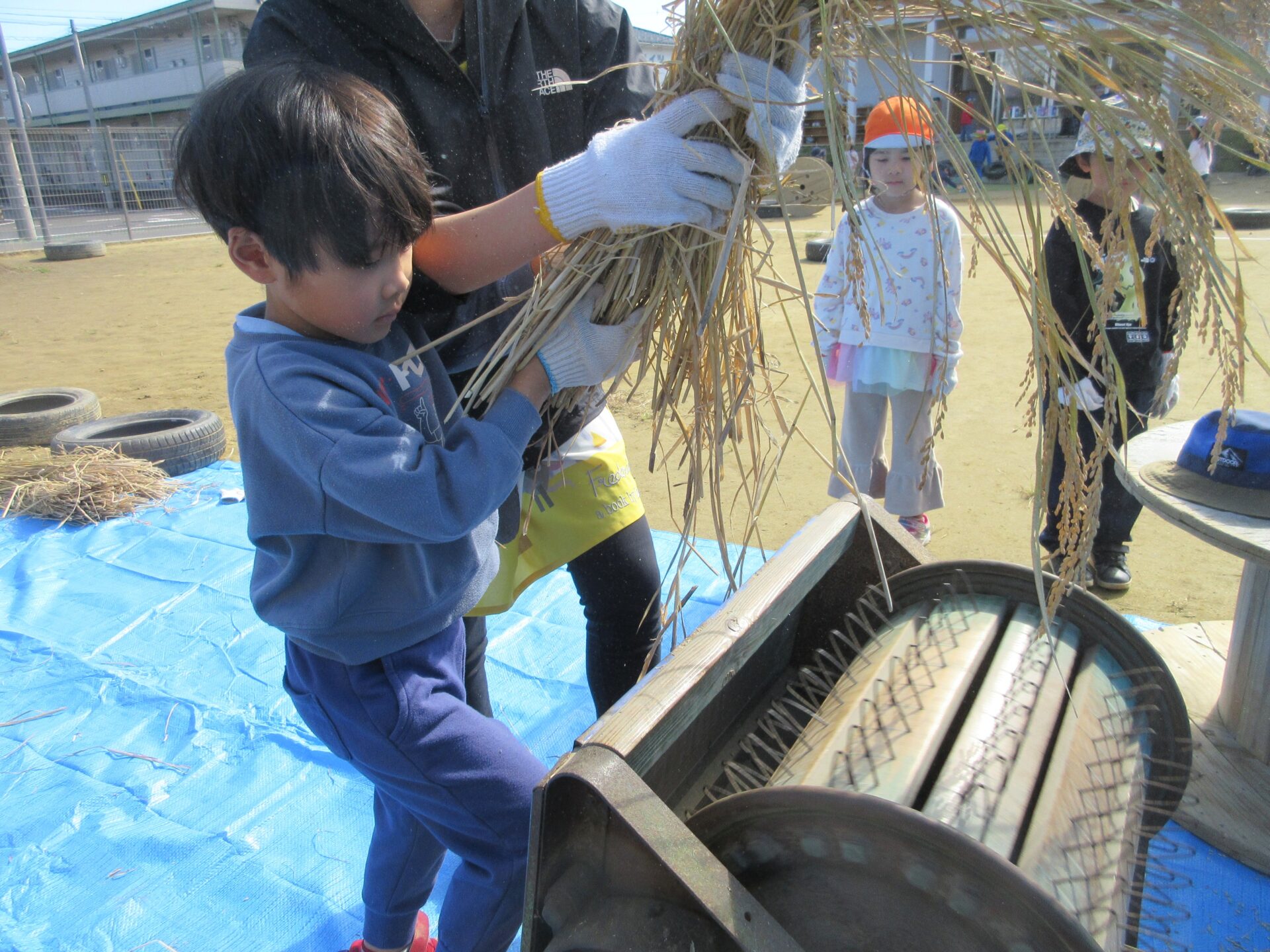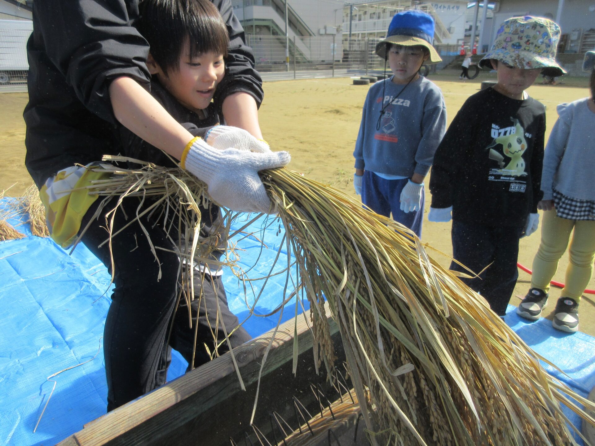 繰り返し取り組む中で、保育者もコツを掴んでいき、無事に脱穀作業は完了しました。