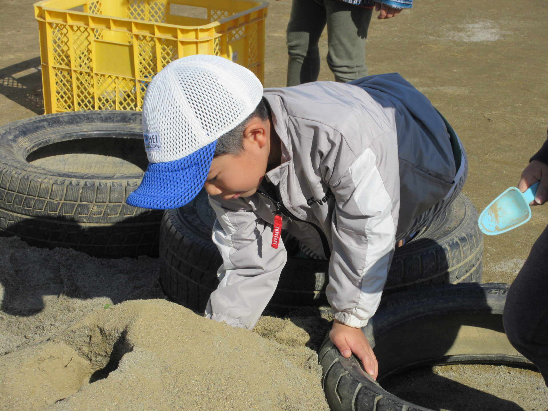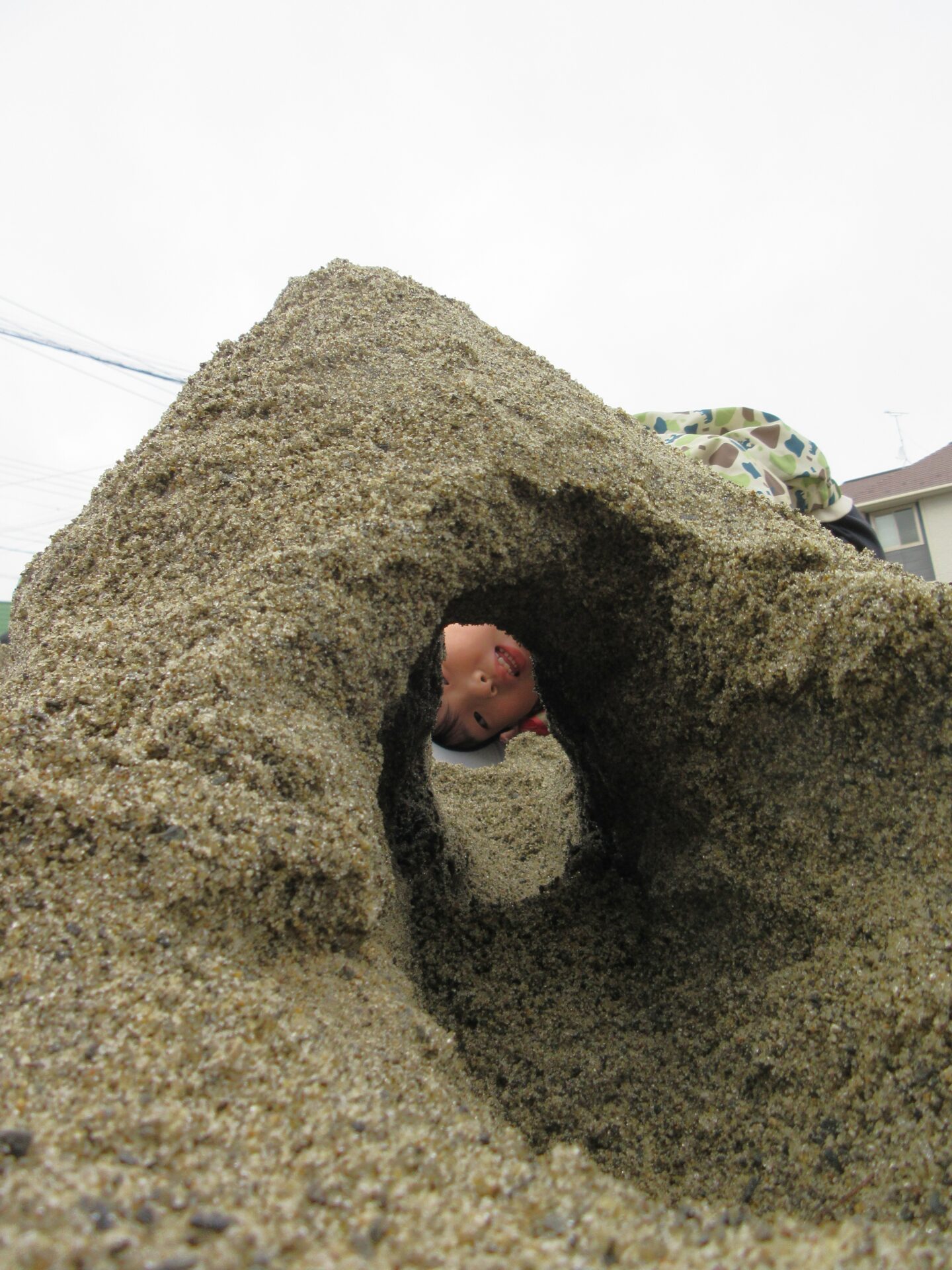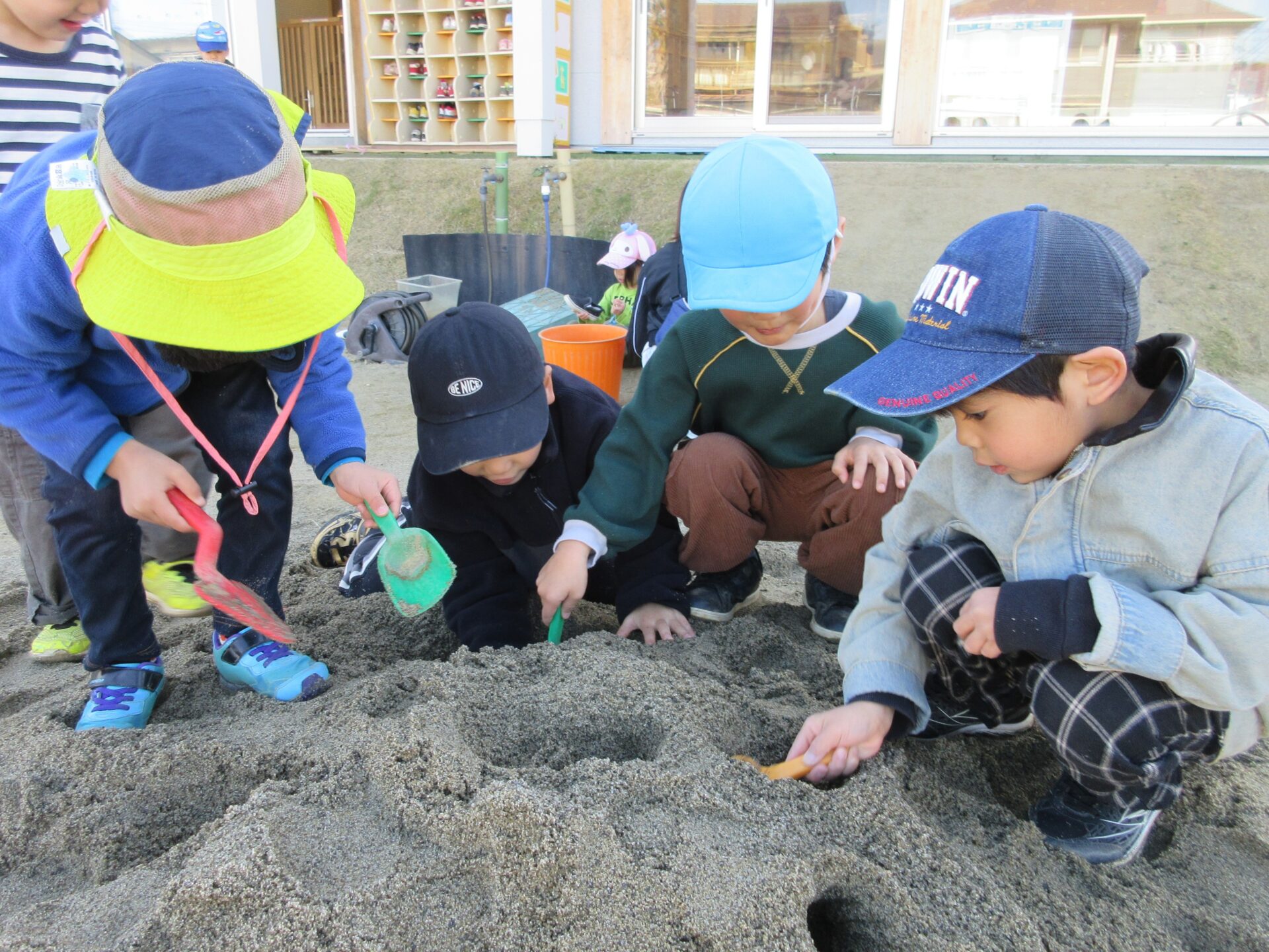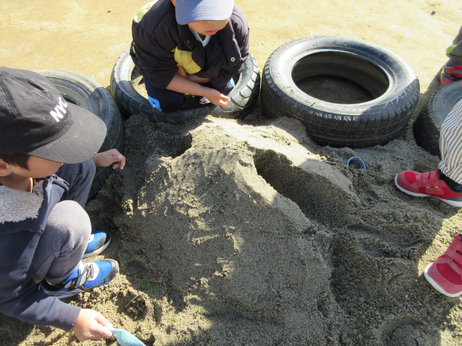園庭に新しい砂が入ってから砂遊びが盛り上がっていて、そら組(4歳児)とくじら組(5歳児)がトンネル作りを楽しんでいます。