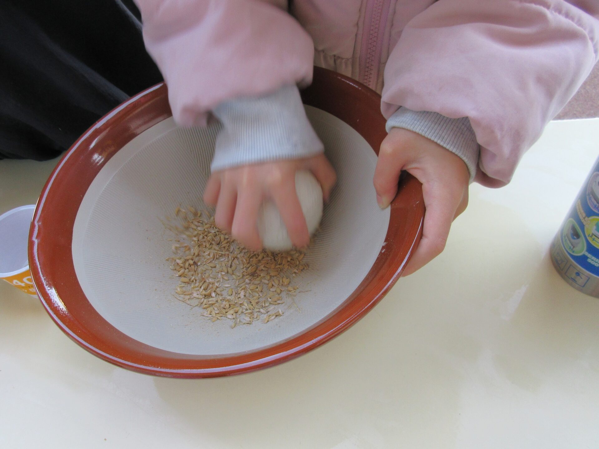 すり鉢に籾を入れ、握った野球ボールを籾に押し当てながら「グリグリ」と回していきます。
