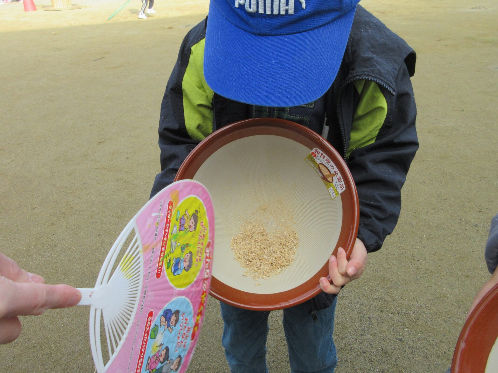 うちわであおぐ強さを調整しながら、籾殻を飛ばす方法を探っています。