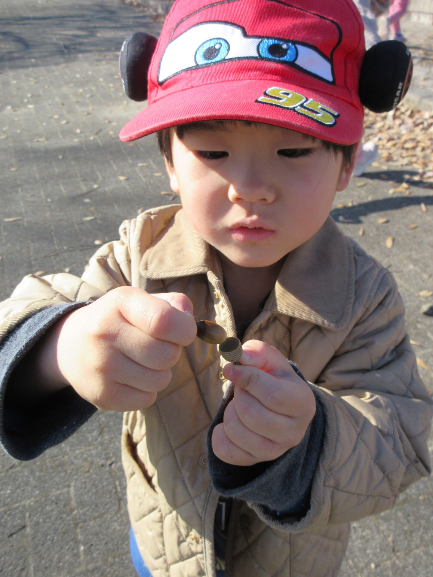 どんぐりを集めているうちに、いろいろな形や模様の違いがあることに気付いたそら組(4歳児)のこどもたちは、図鑑で調べてみることにしました。