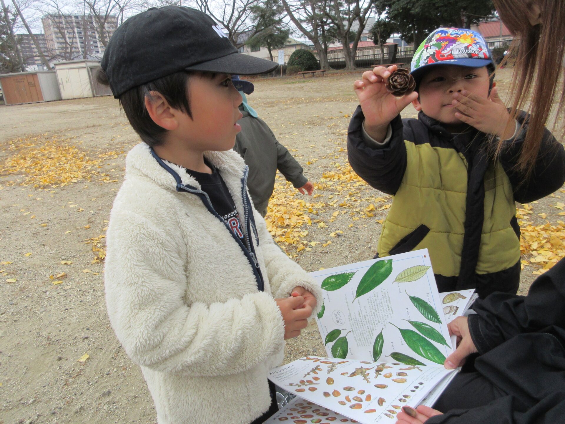 たくさんのどんぐりが載っている図鑑と、見つけたどんぐりを照らし合わせていきます。