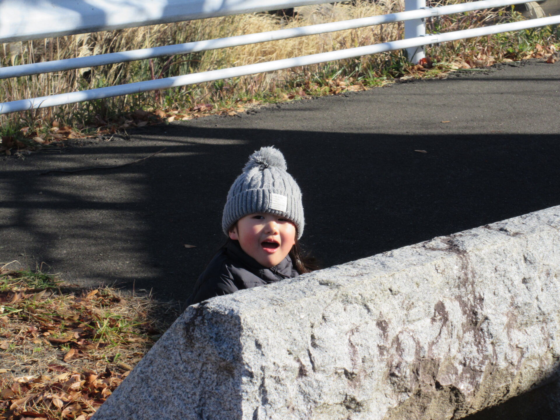 ベンチの下や石碑の後ろに隠れています。