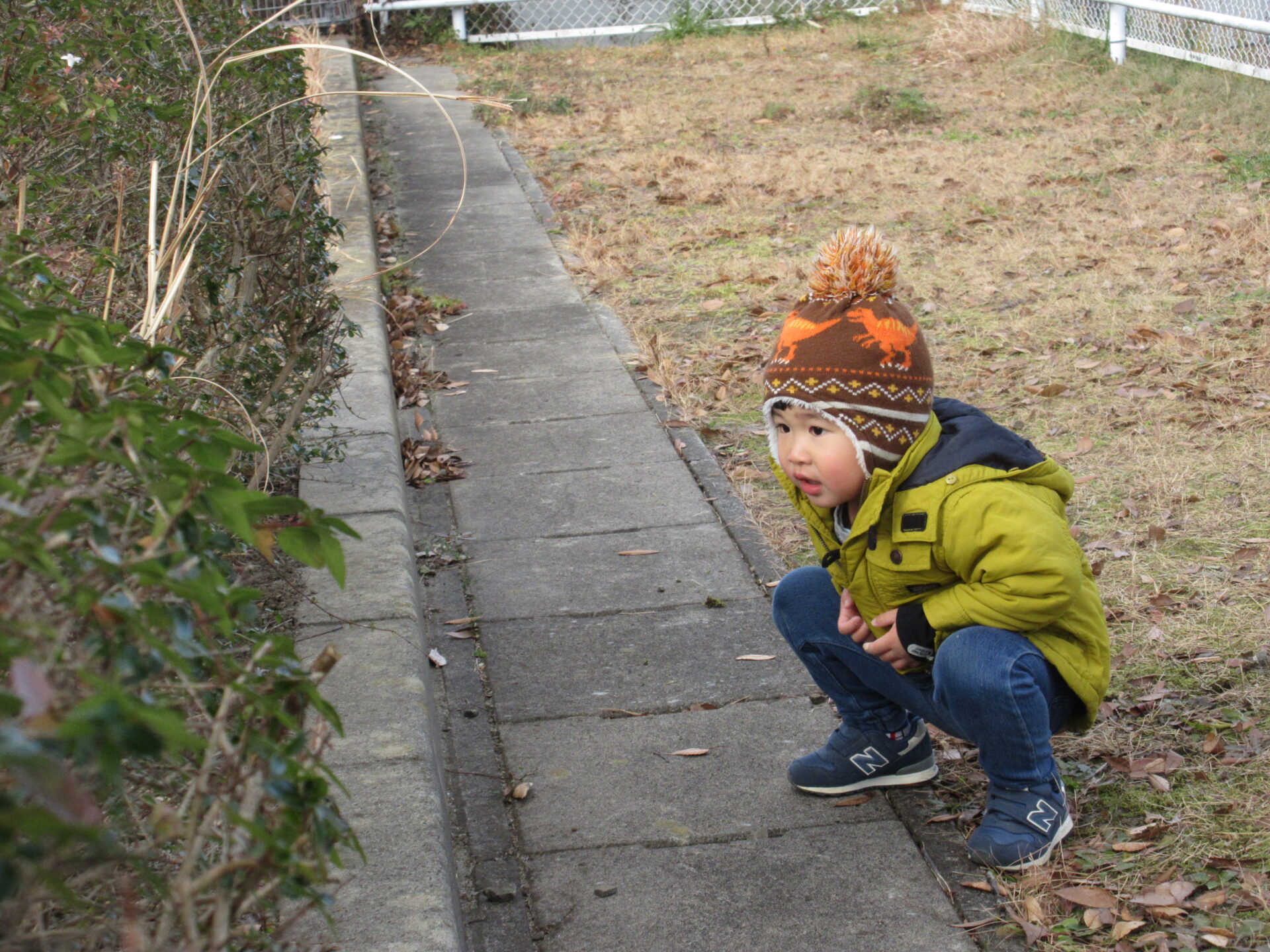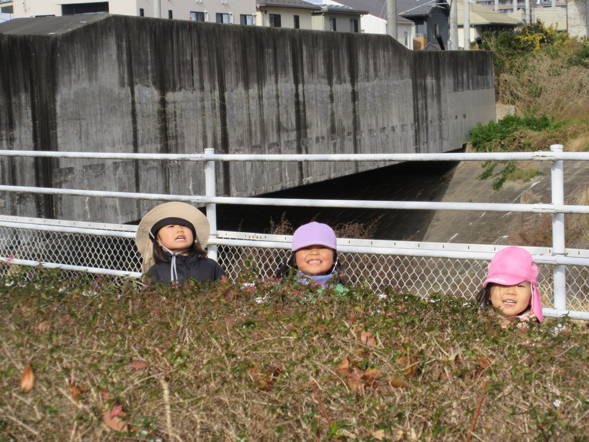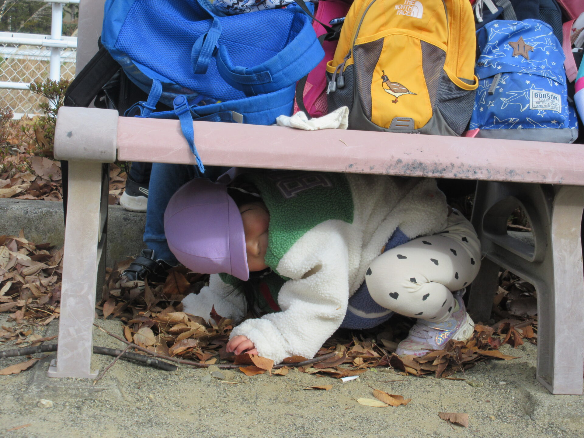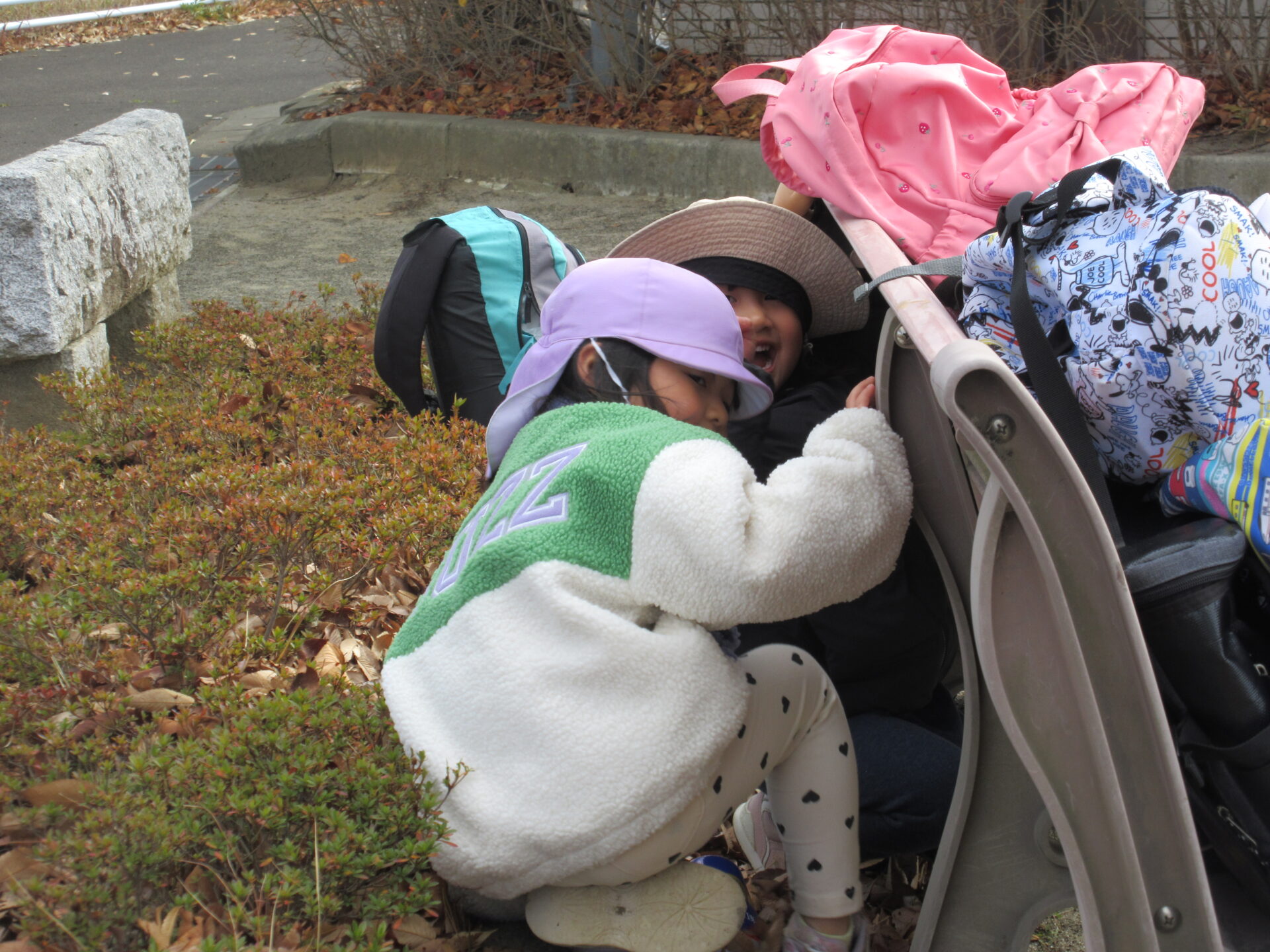 にじ組(3歳児)が公園で、かくれんぼをしています。