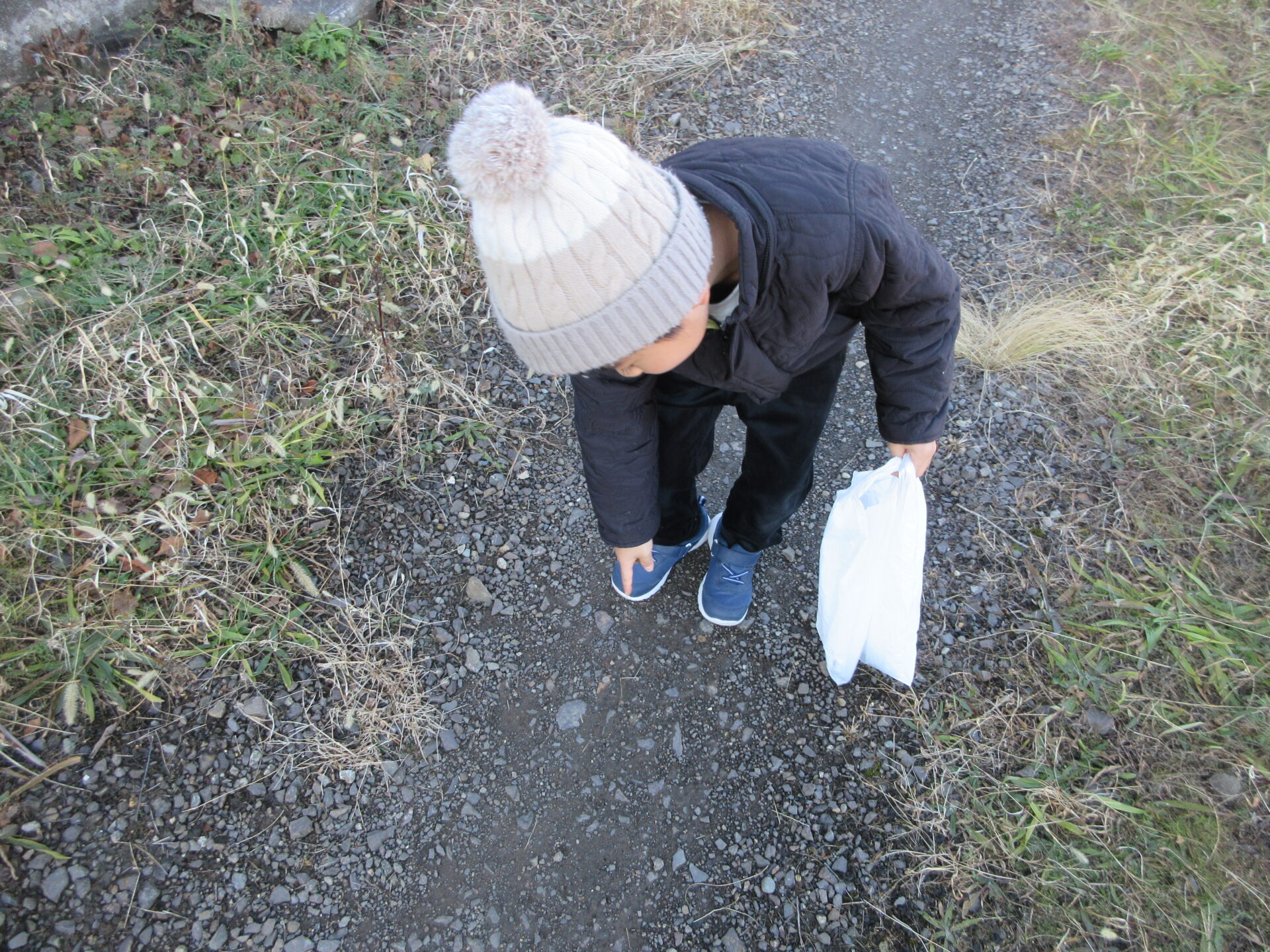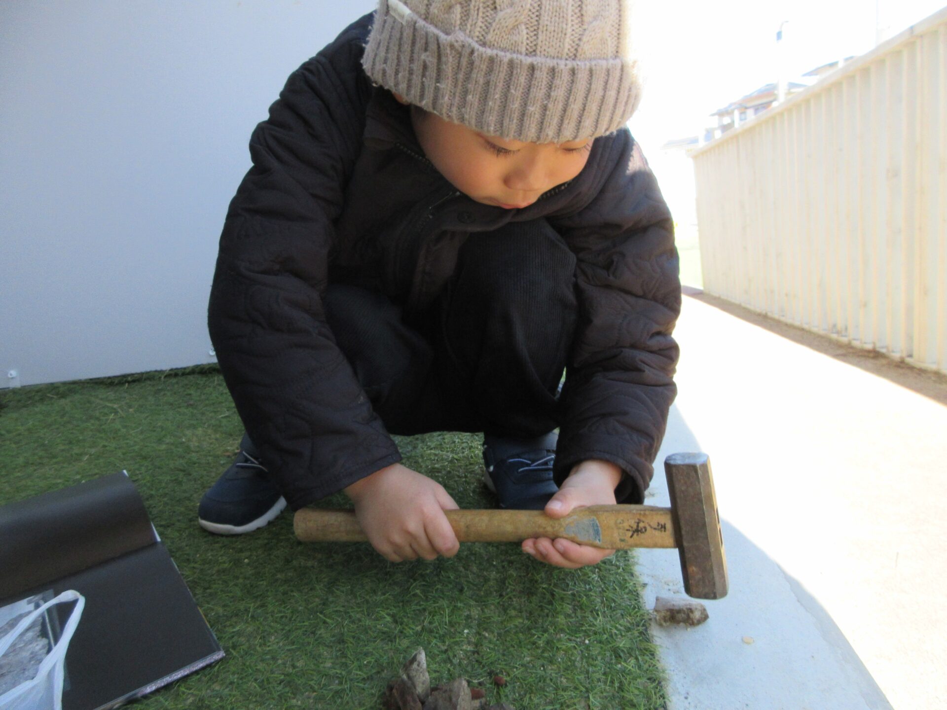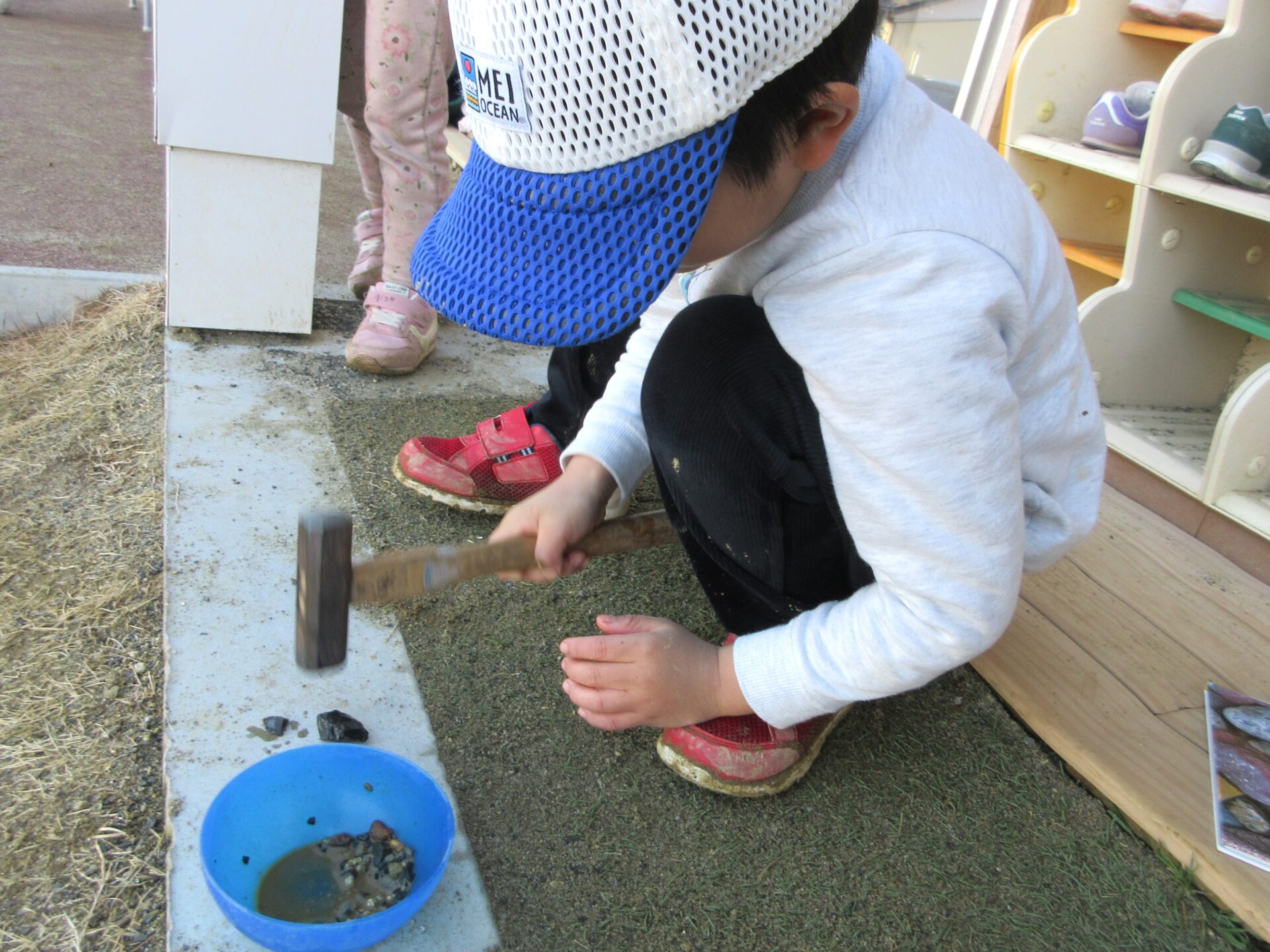そんな身近な石に興味をもった4歳児のAさんが園の周りの石を集めています。