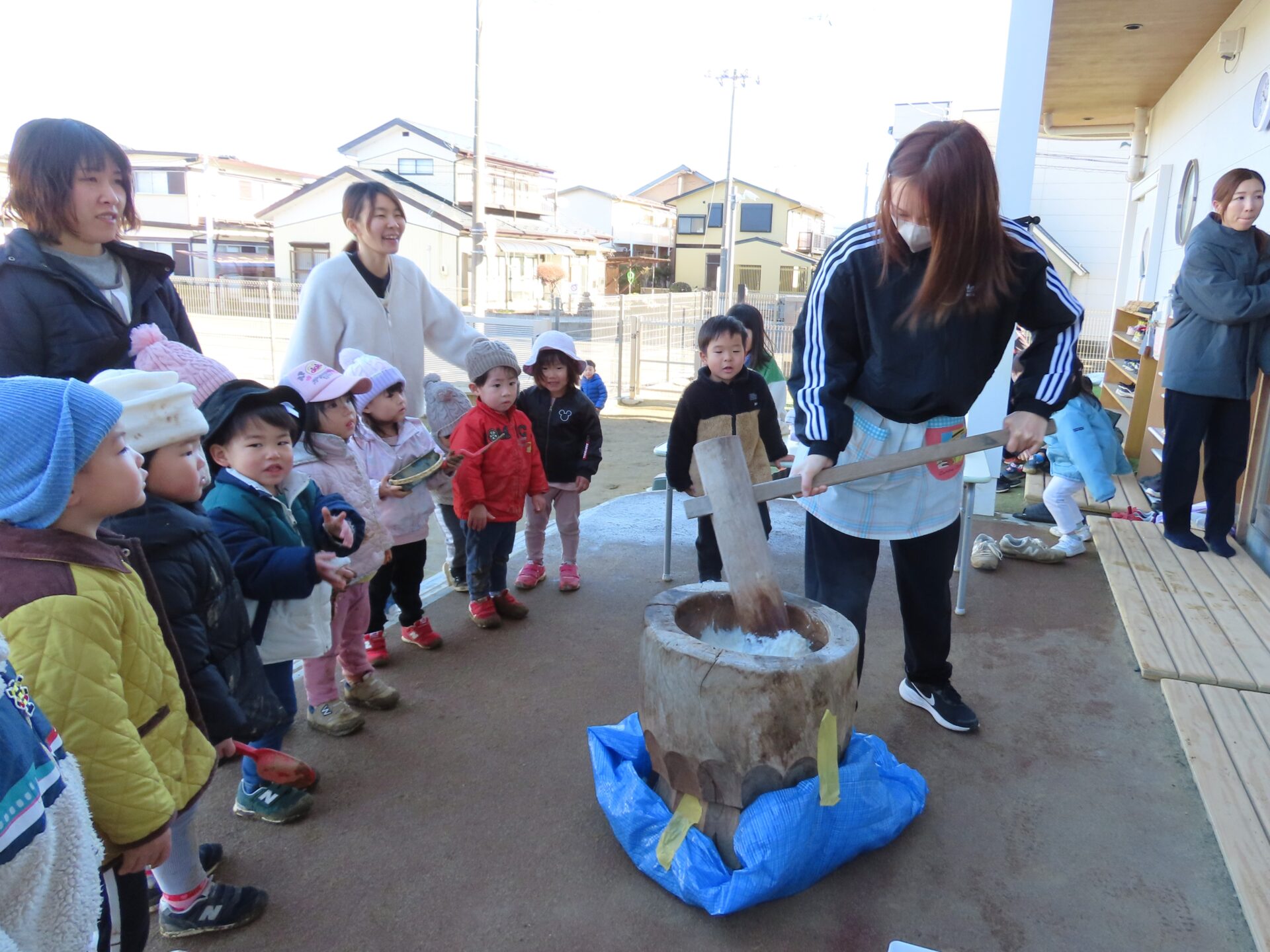 一年の締めくくりに保育園では、くじら組(5歳児)が「鏡餅を作ろう!」と、餅つきを行いました。
