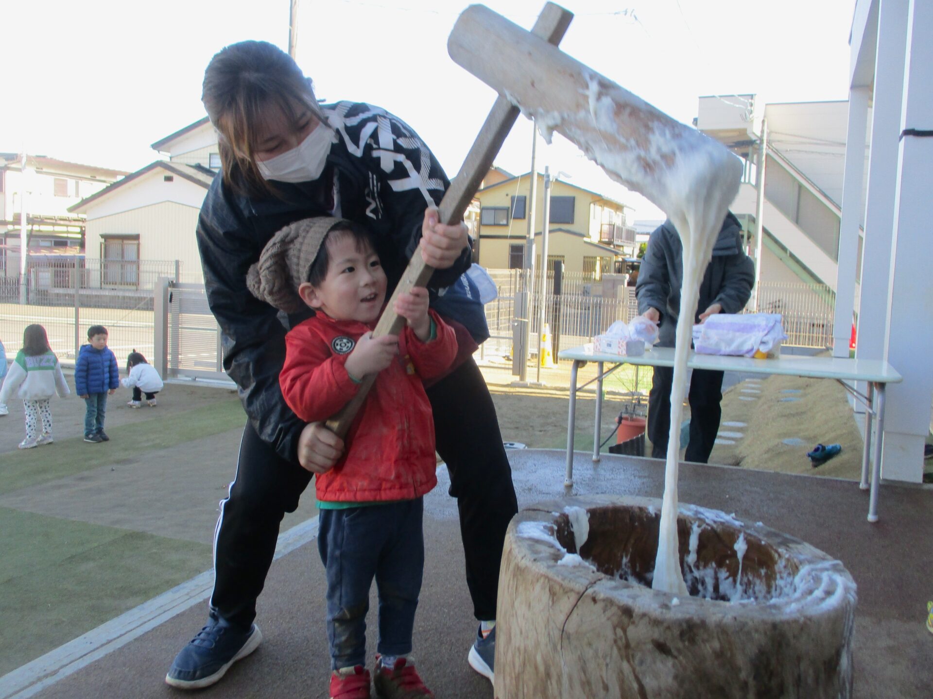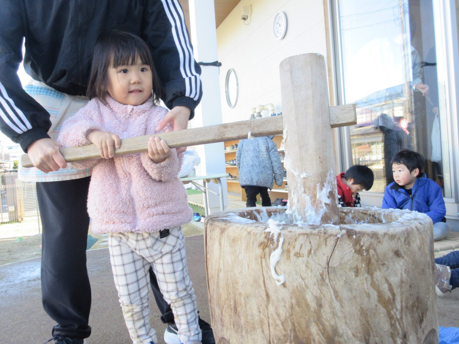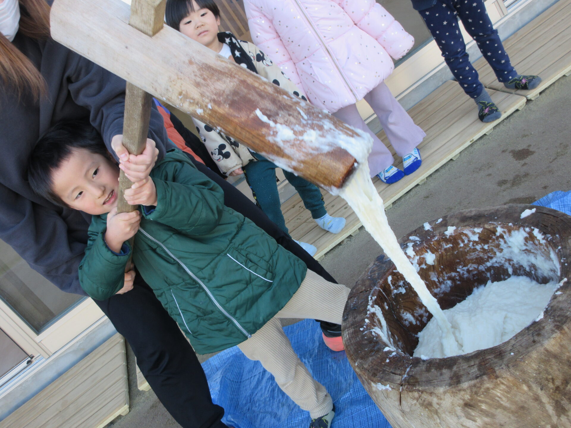 くじら組(5歳児)は、重たい杵を自力で動かして餅をつくことができました!
