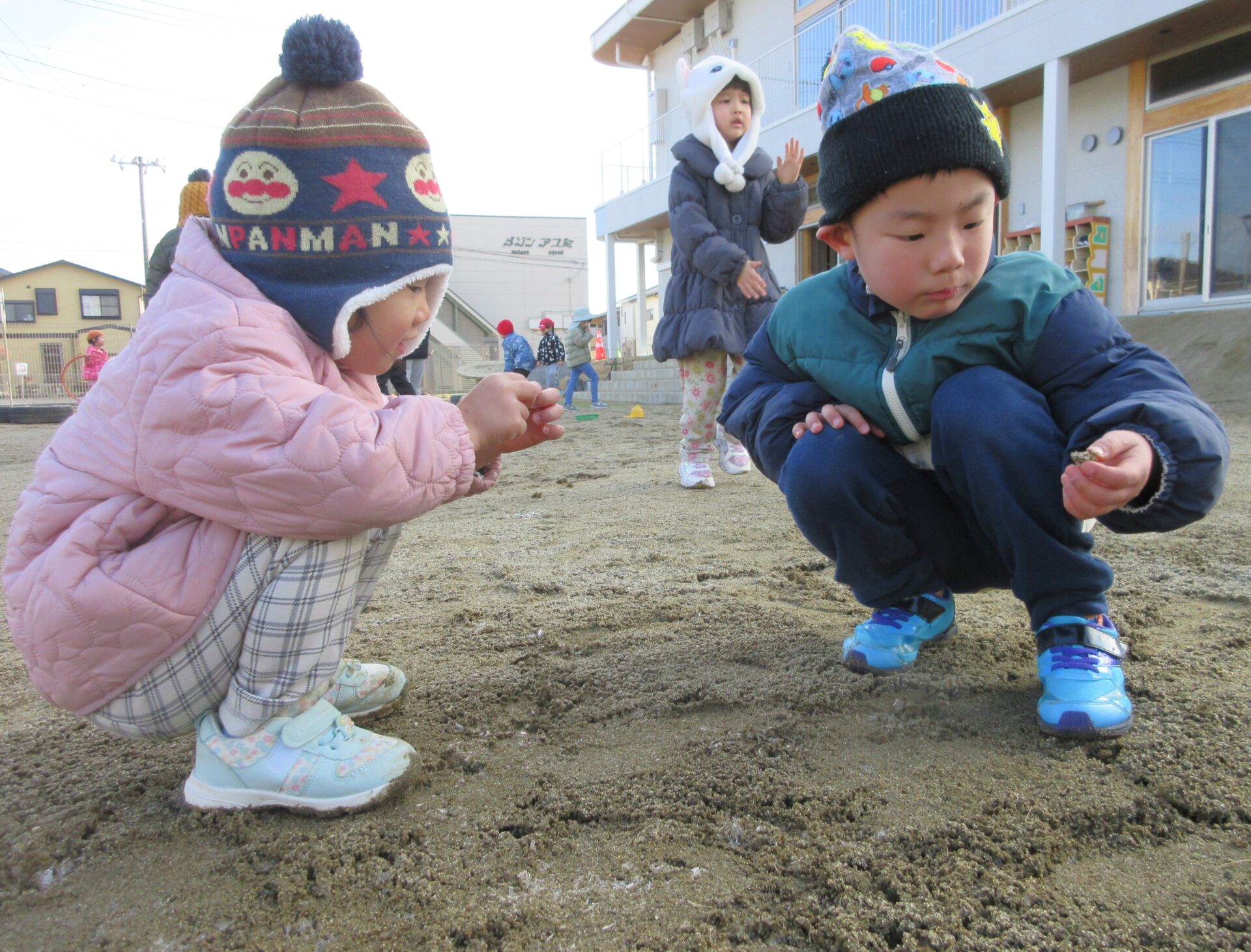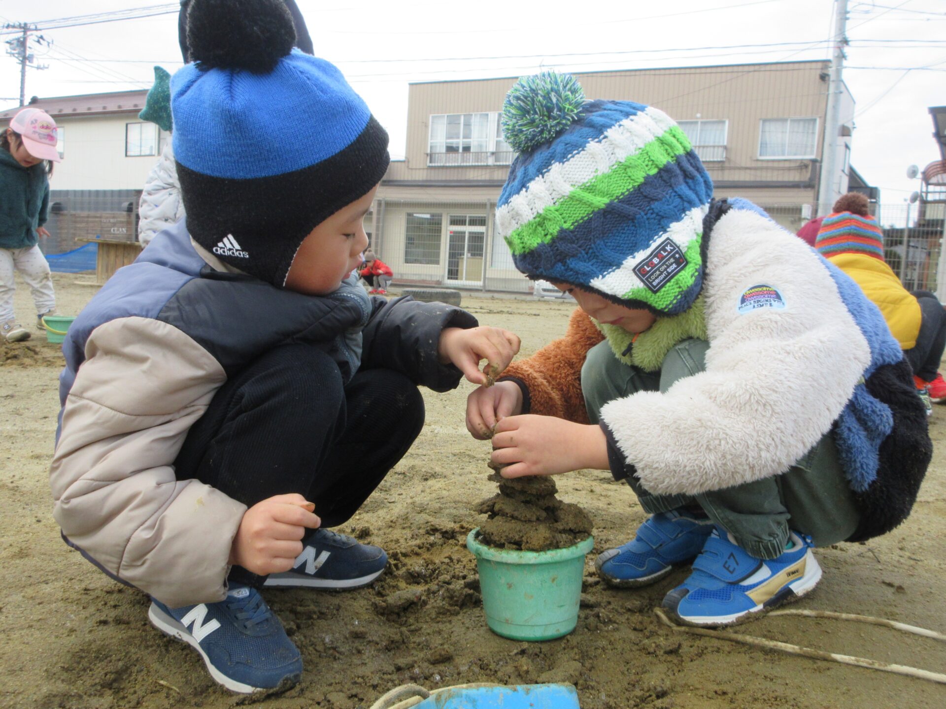 固まった土を積み重ねて遊ぶ子どもたちも、冬ならではの発見を喜びながら様々な遊びを楽しんでいます。