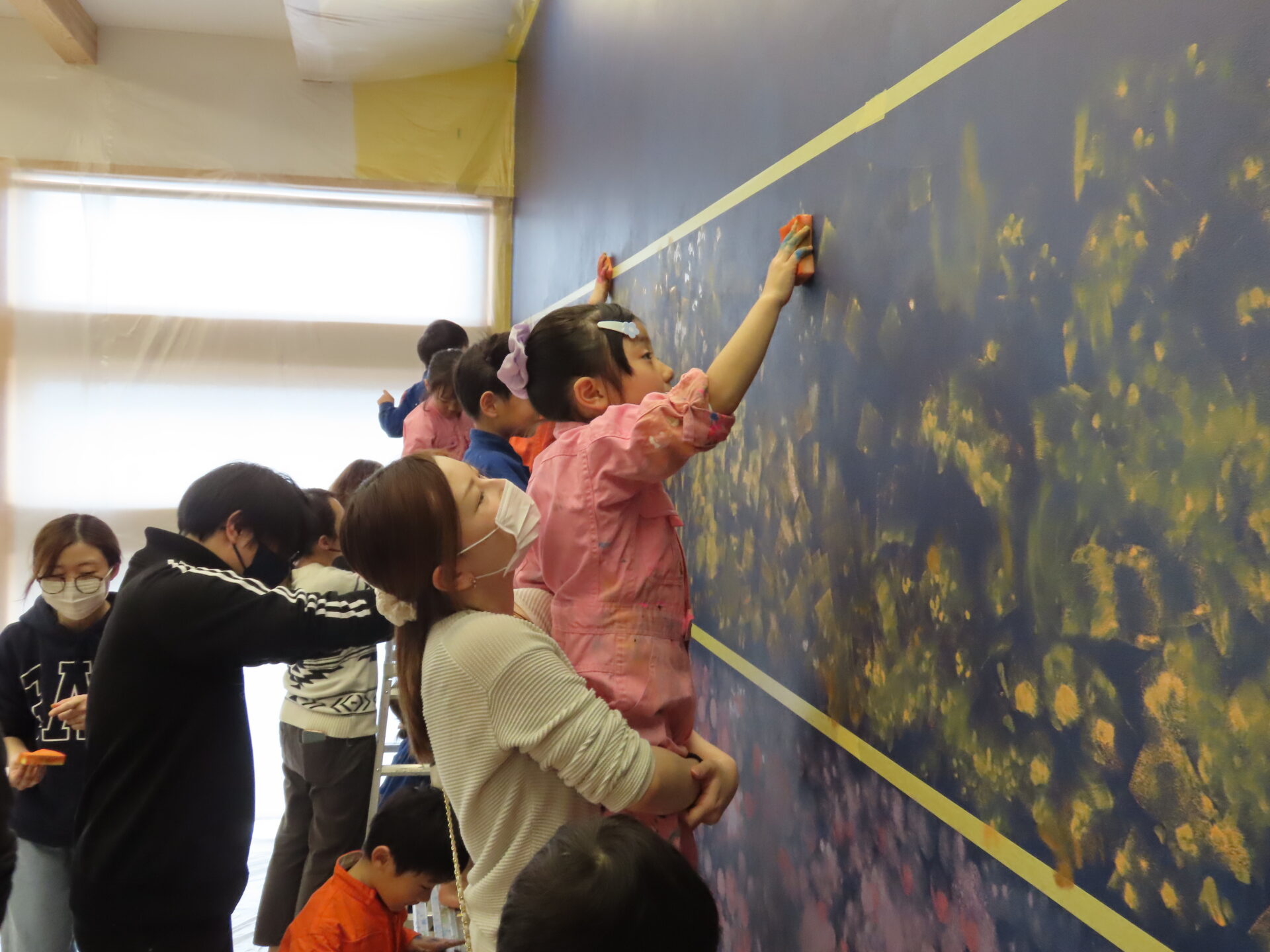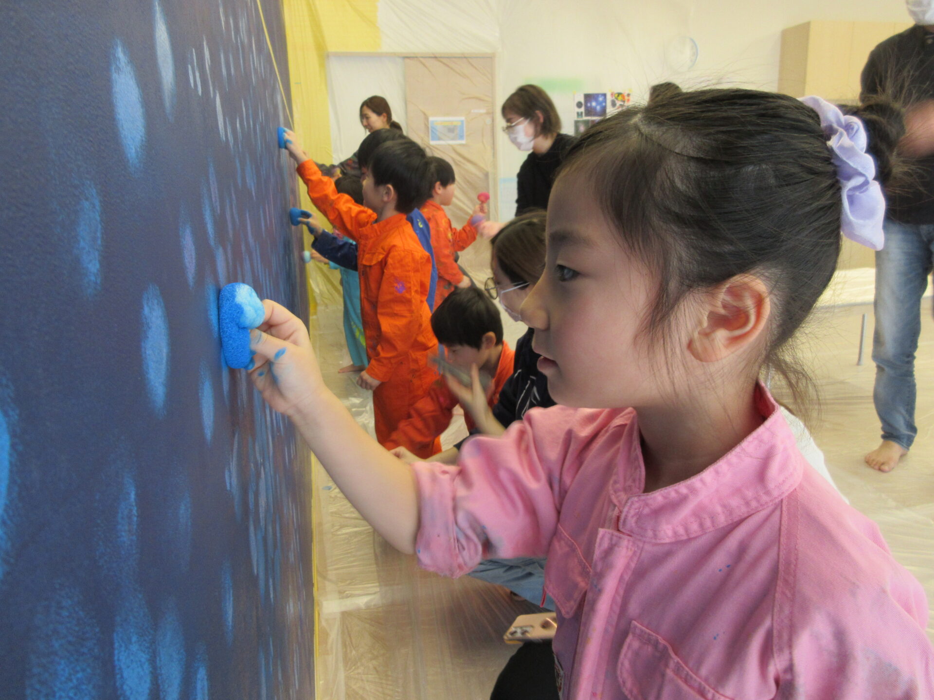 星や宇宙への興味が続いているくじら組(5歳児)のこどもたちから、「おへやの壁に宇宙や惑星をかきたい!」と、声があがりました。