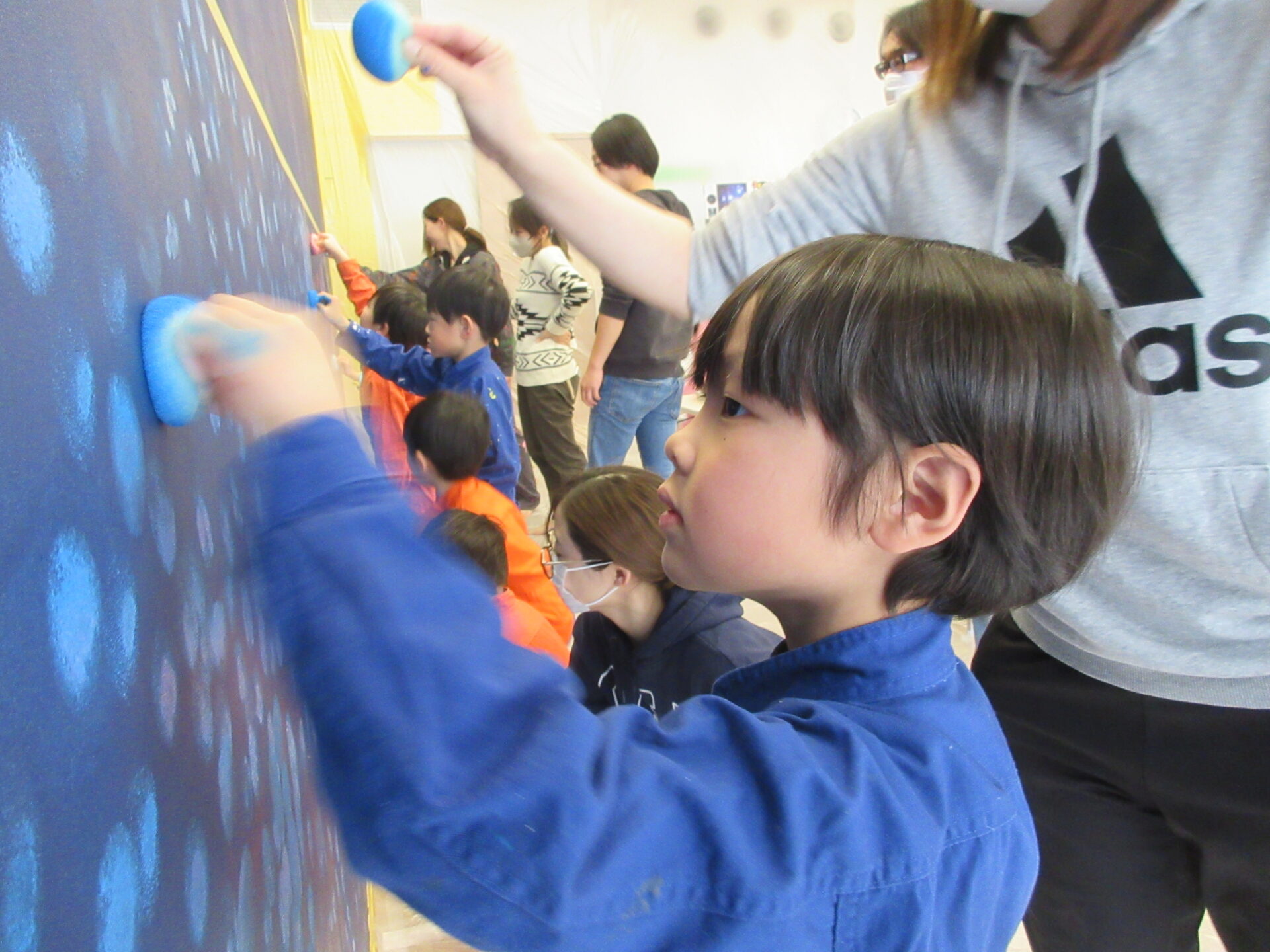 5歳児保育室の壁面の一部は、こどもたちと共同制作ができるスペースになっています。
