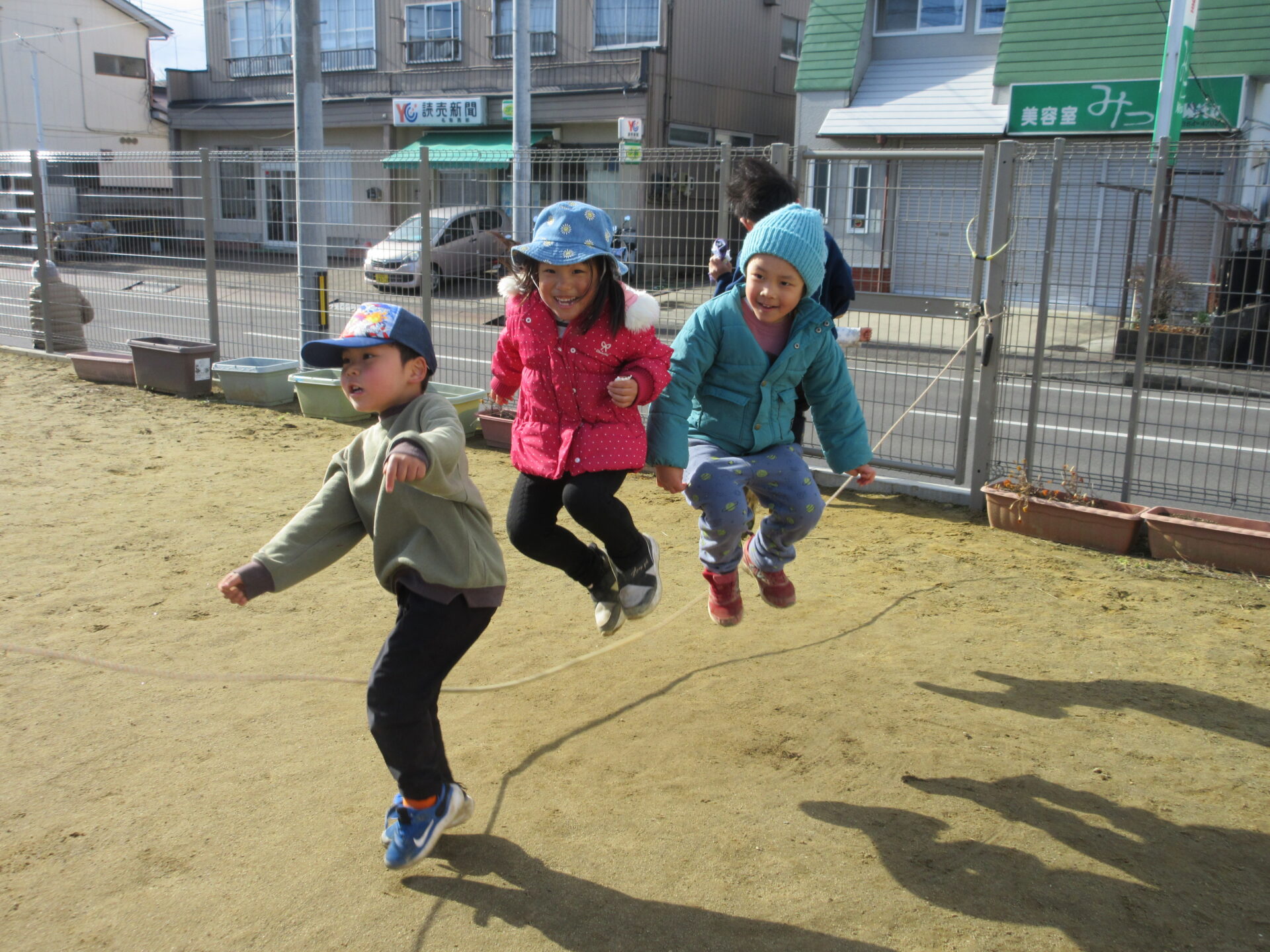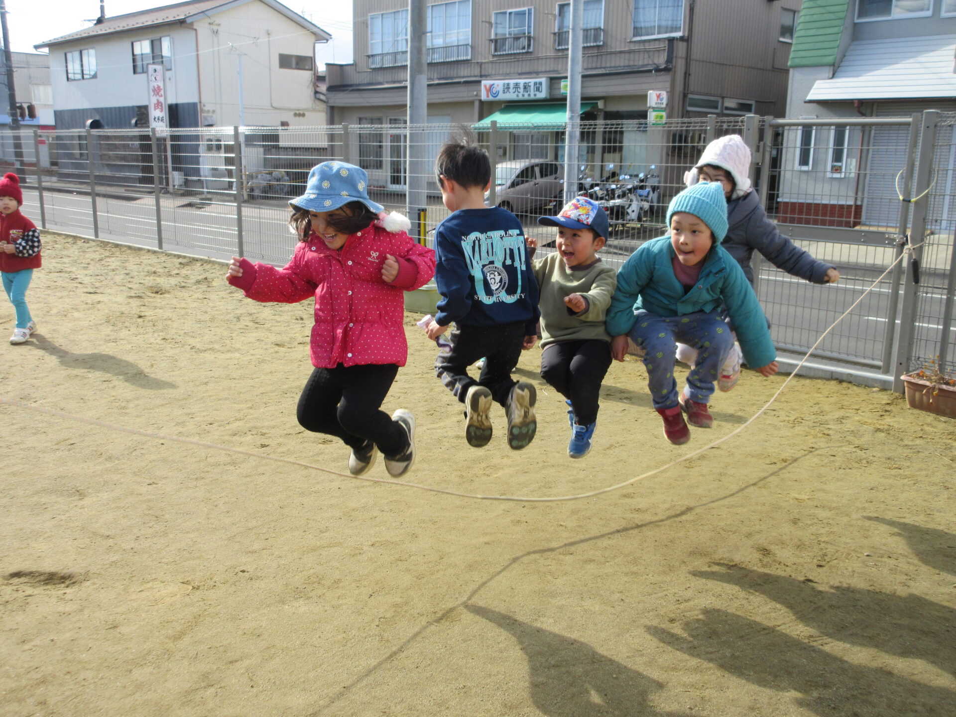 1人で何回、連続で跳べるかチャレンジしていたこどもたちのブームは、「何人で跳べるか?!」にチャレンジ内容が変化しています。