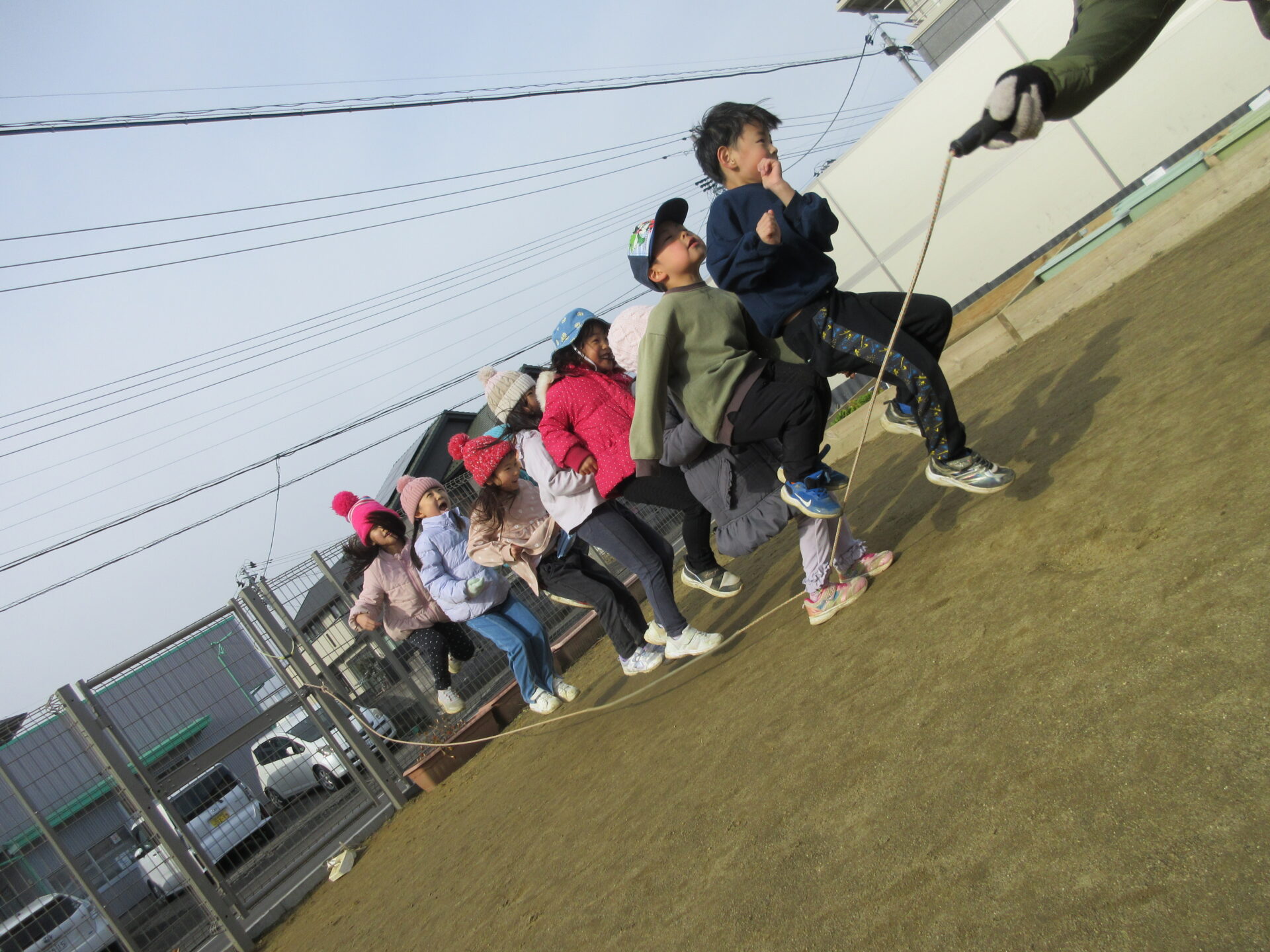 そら組(4歳児)・くじら組(5歳児)のこどもたちが園庭で大縄跳びに挑戦しています。