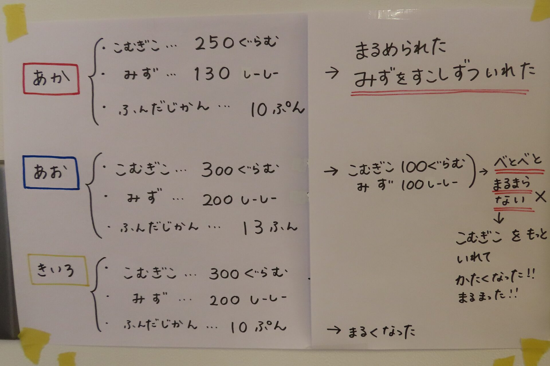 3チームに分かれて、作り方を調べたり、水や粉の分量や入れ方も、チーム毎に考えました。