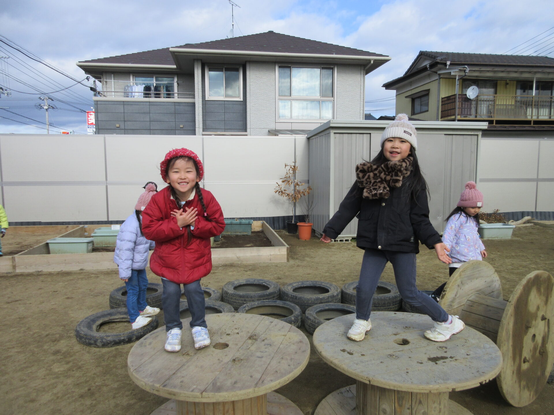 園庭にあるコイルをこどもたちはタイヤと組み合わせてアスレチックを挑戦したり、ままごとのテーブルに使ったりして遊んでいます。