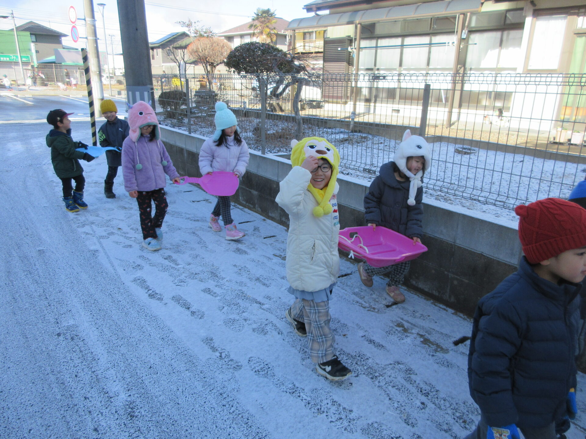 園庭でしばらく遊んだ後、2丁目公園でそり遊びができるのではないかと考えたそら組は…