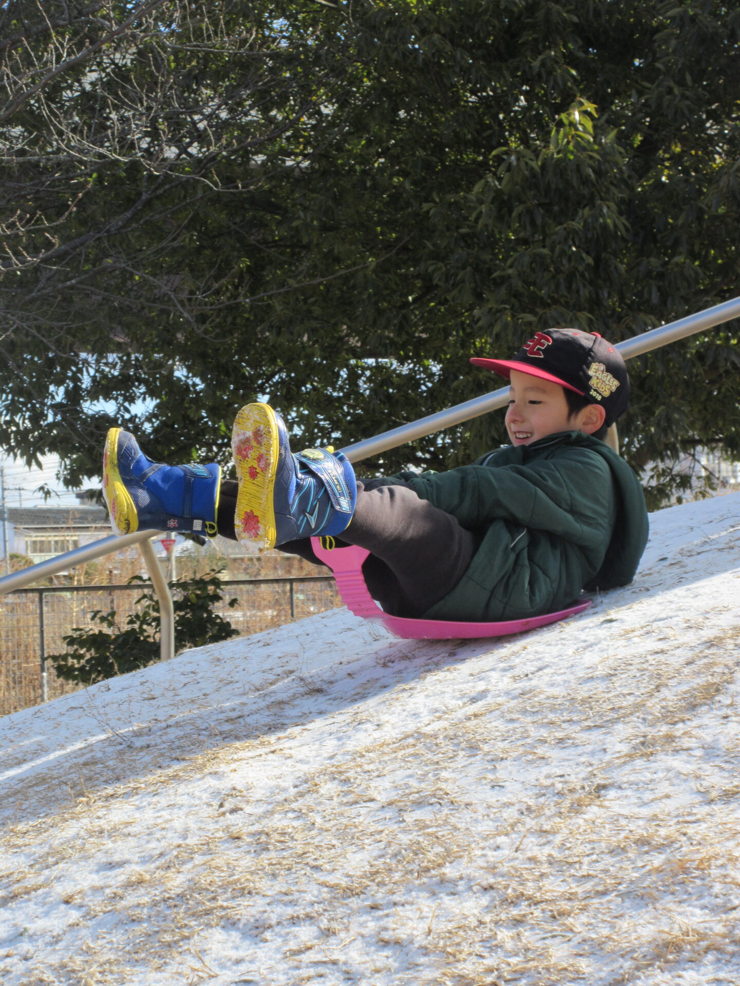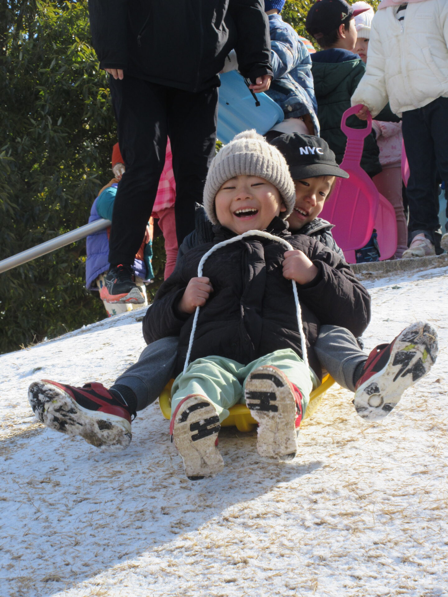 築山にもうっすら雪が積もっていて、そり遊びスタートです!