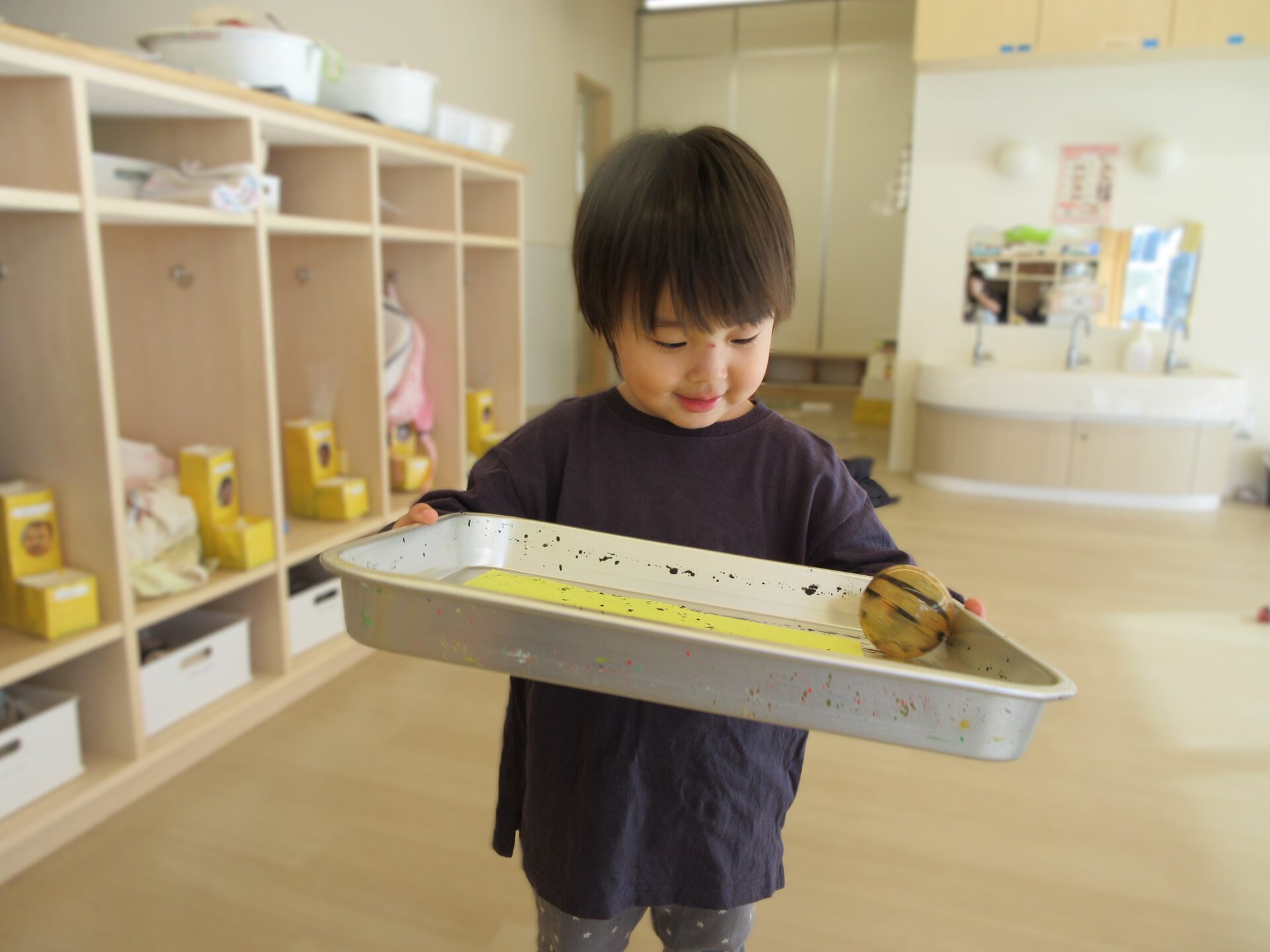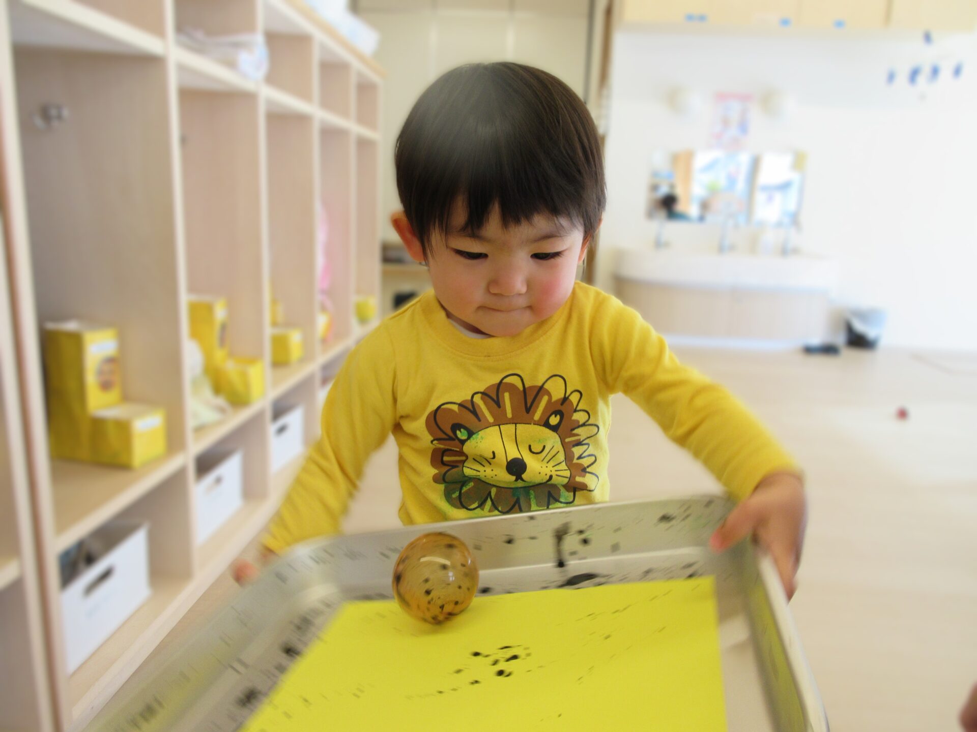 ボールを転がすたびに模様が付いていく様子が面白くて、何度もトレイを傾けることに夢中になります。