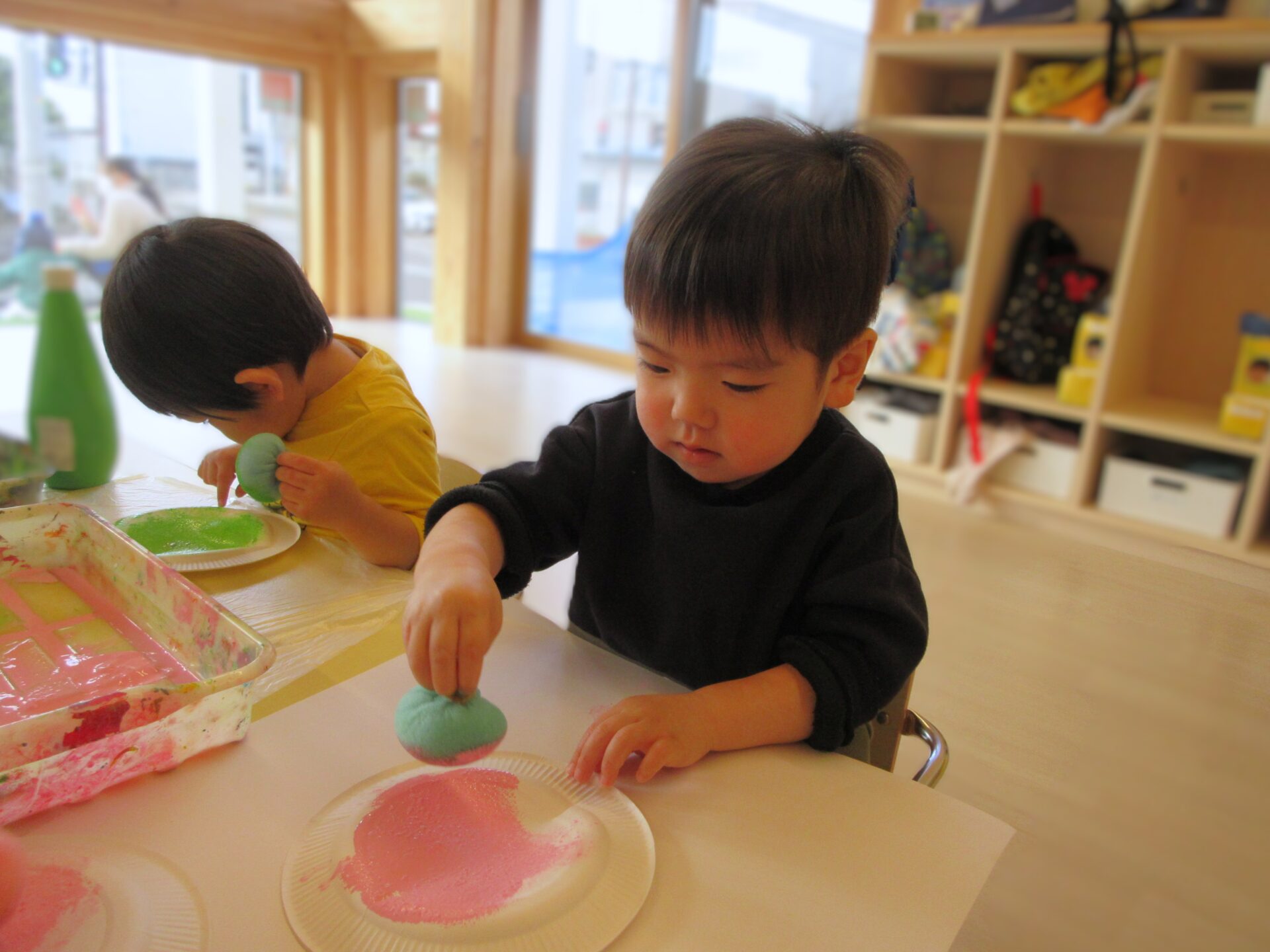 スポンジの柔らかな感触と絵具が広がっていく様子を楽しみます。