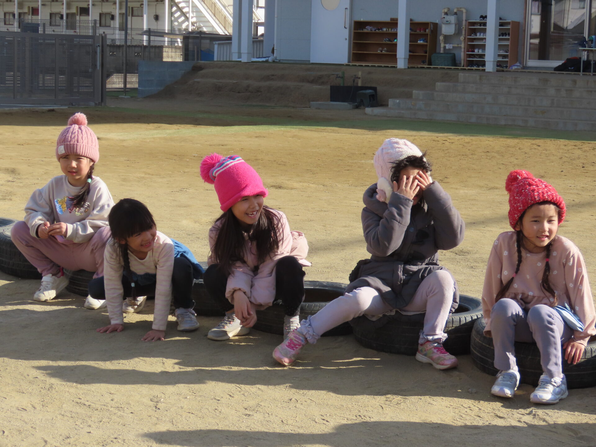就学に向けてお昼寝をしないで過ごしているくじら組(5歳児)が午後の暖かい陽気の中、なにやら楽しそうに集まっていました。