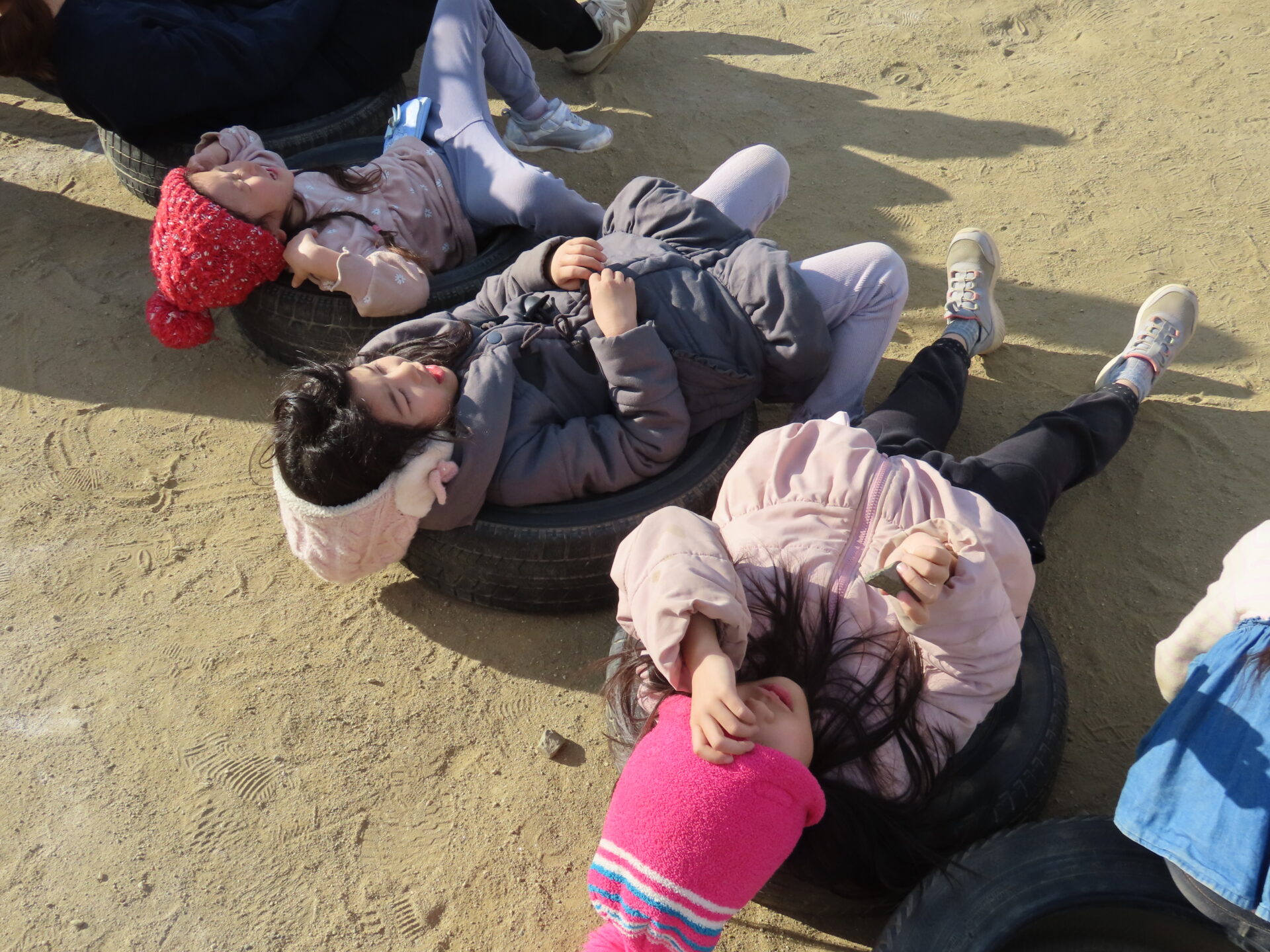 タイヤに座っていたかと思いきや、今度はタイヤに寝転びました。
