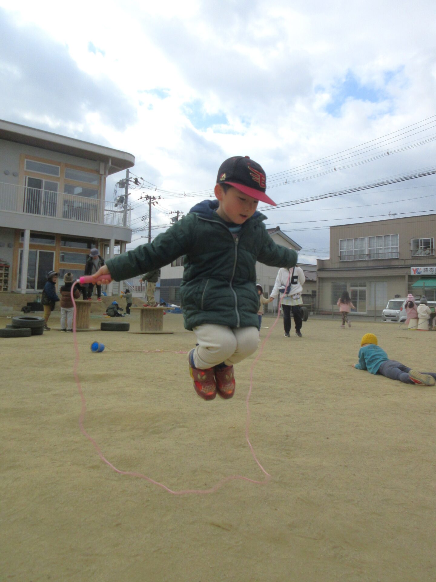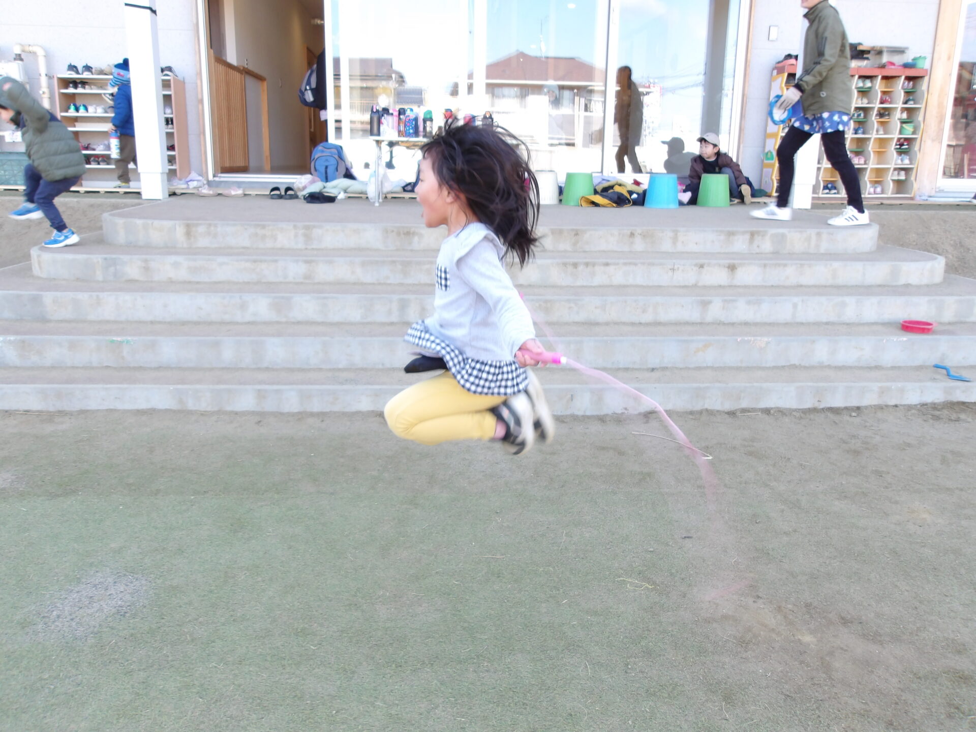 大縄跳びで「ひとりで何回跳べるか」、「何人まで増やして跳べるか」等、様々なルールを決めて楽しんでいる遊びに新たな変化が見られてきました。