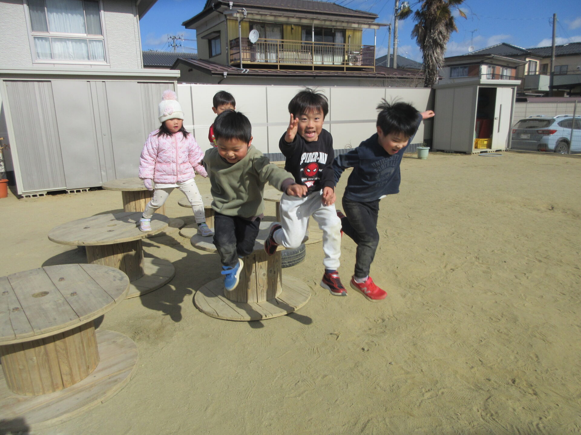 そら組(4歳児)のこどもたちが夢中になっている遊びのひとつが「ジャンプごっこ」です。