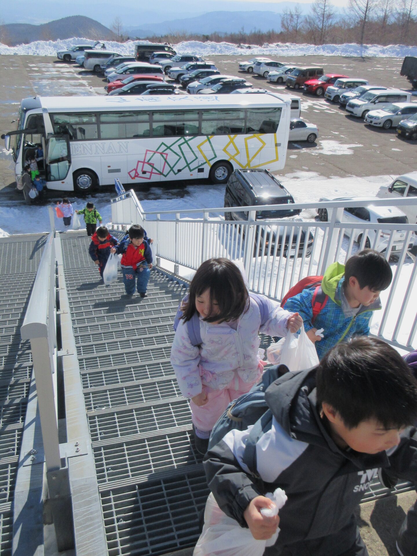スキー場へと続く長い階段をワクワクした気持ちで元気に登っていきます。