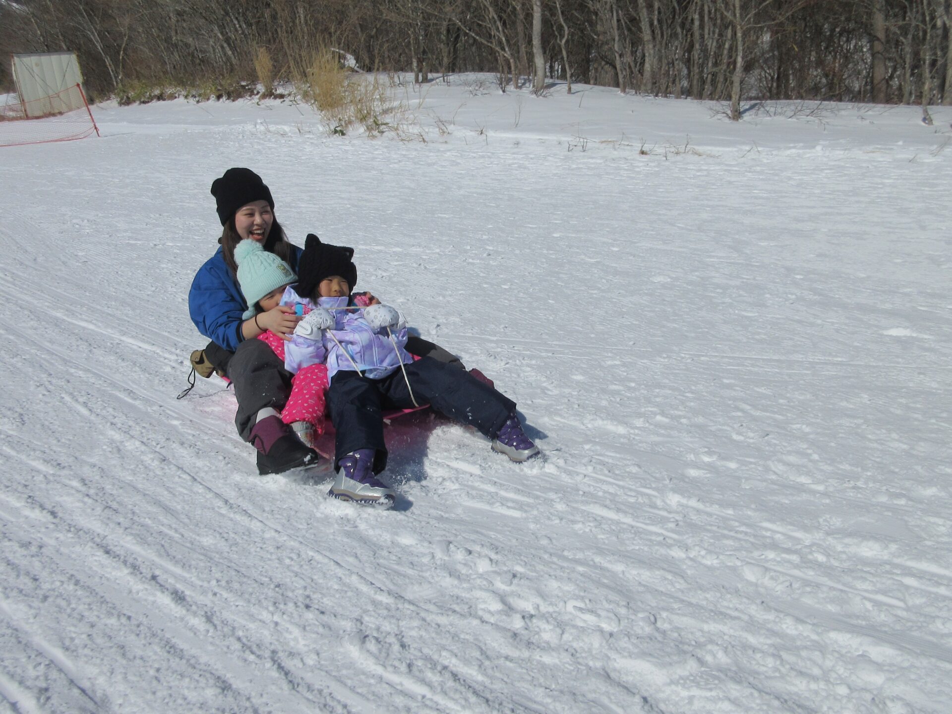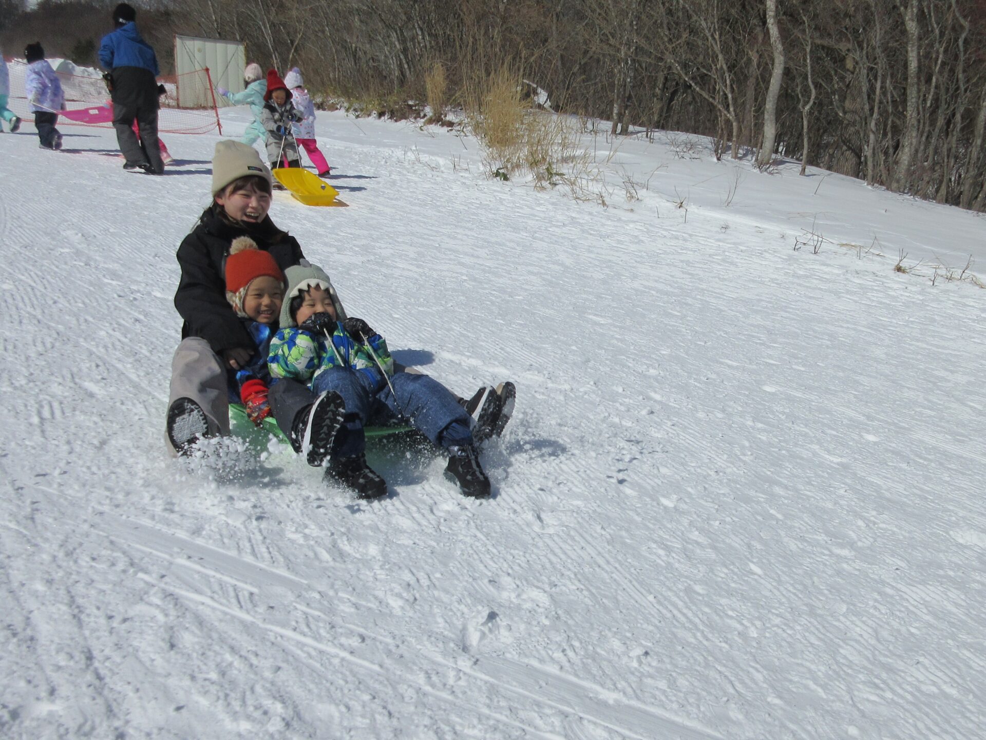 そり遊びでは、子どもたちと一緒に職員も滑ります!