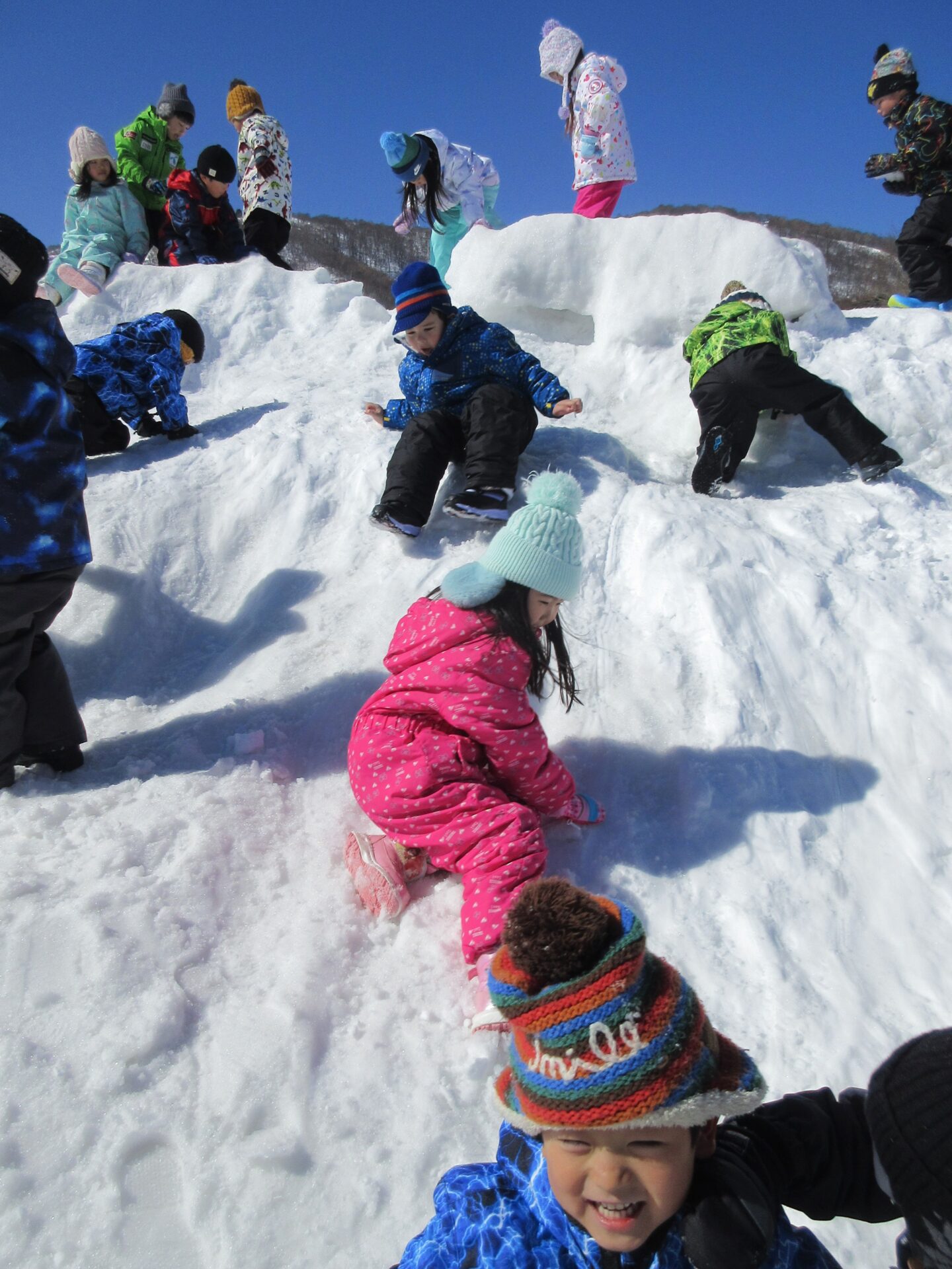 登った後は、雪山を滑り台のようにして滑り落ちて遊びます!