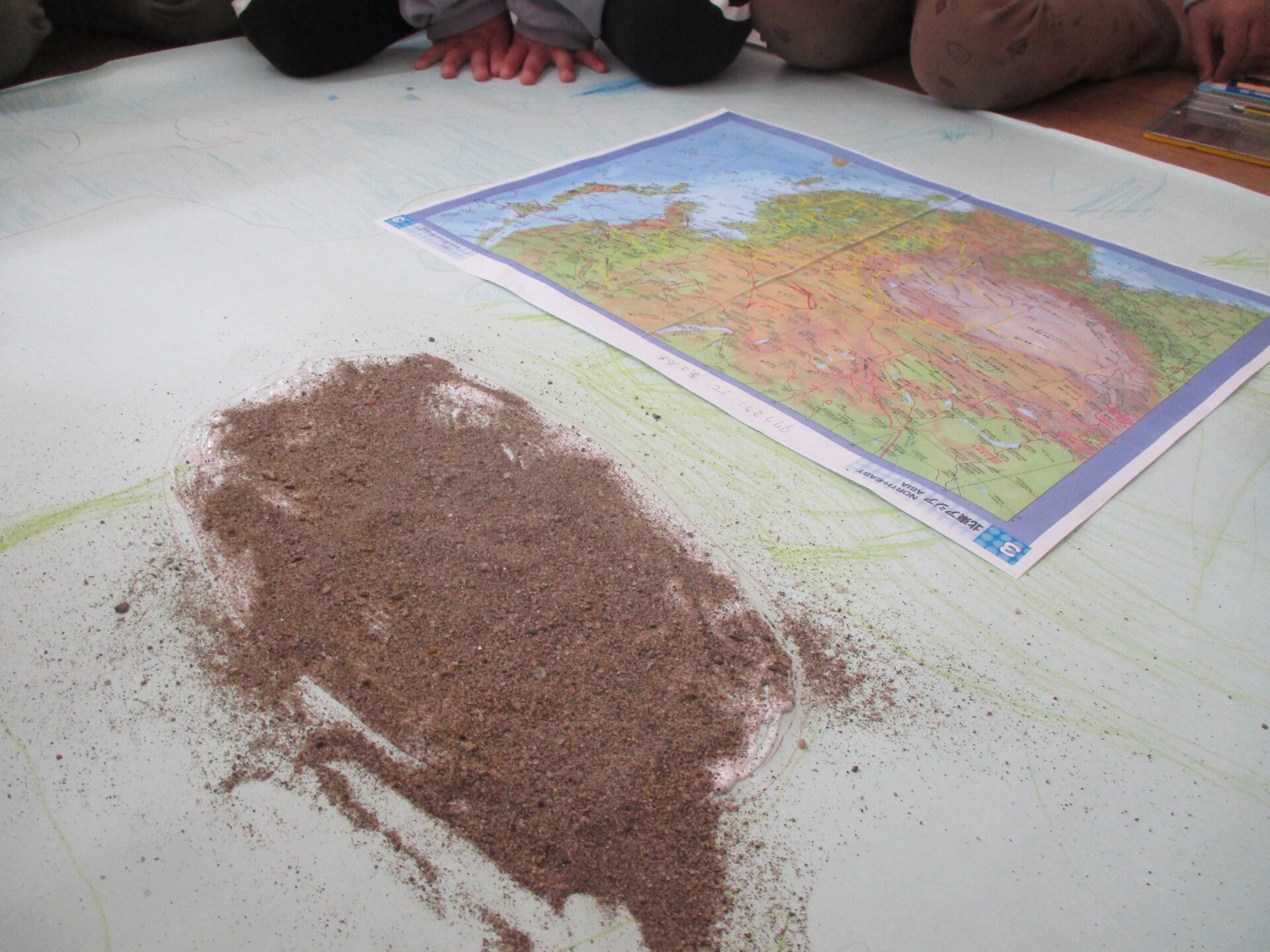 先日の黄砂予報で園外活動を延期したところ、5歳児クラスでは「黄砂ってなに?」と考え始めました。皆で話し合い、お家の人に聞いたりしたことを教え合い、「中国から砂が飛んでくる」ことを知った子どもたち。「中国って、どこ?」と地図を調べ始め・・・、砂漠作りが始まりました。