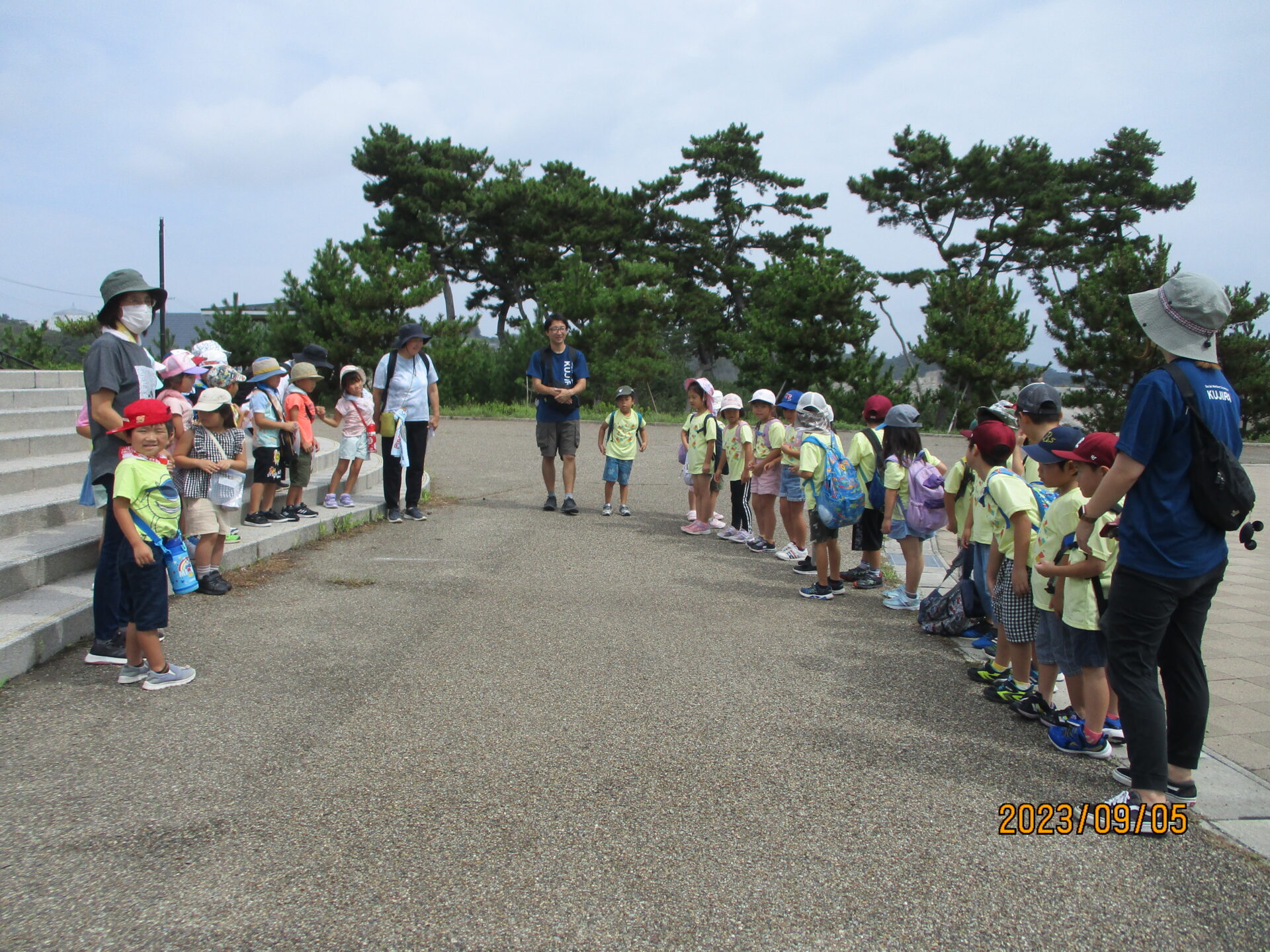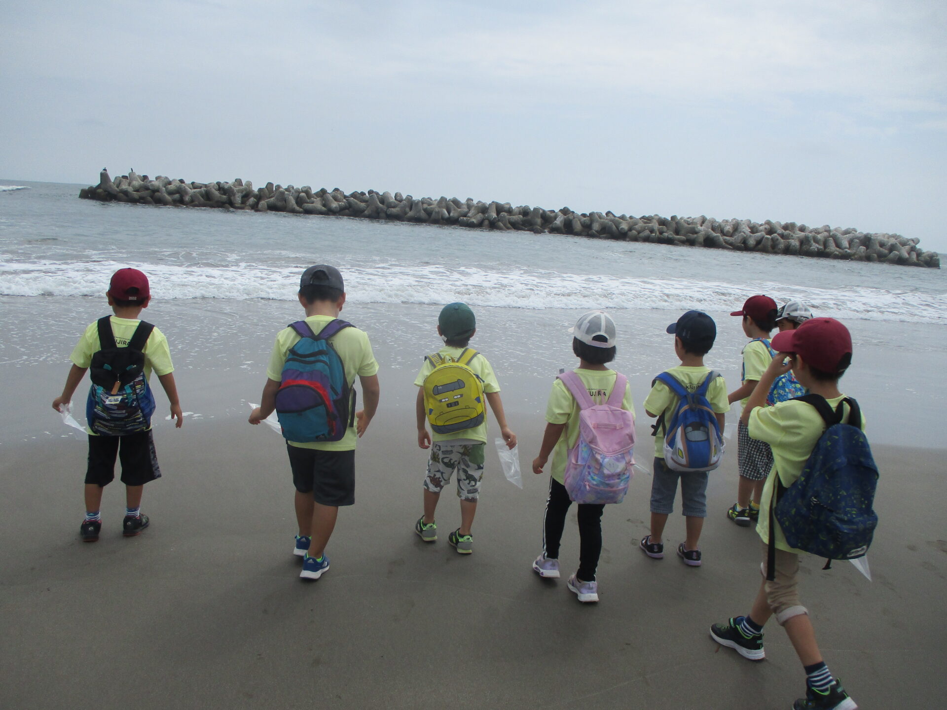 バスに乗って、宝物を探す場所の菖蒲田浜海岸に到着!姉妹園のバオバブ保育園のお友だちと合流し、一緒に宝物を探すことに。