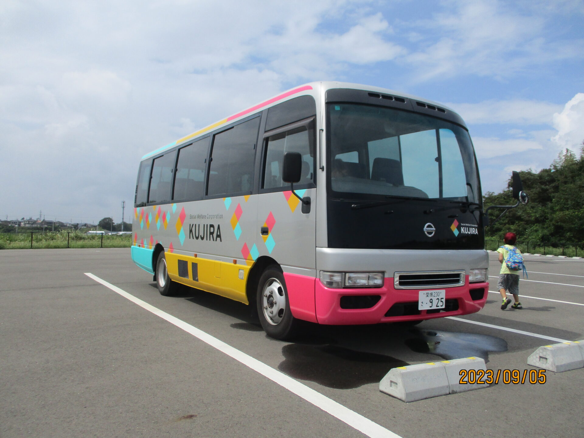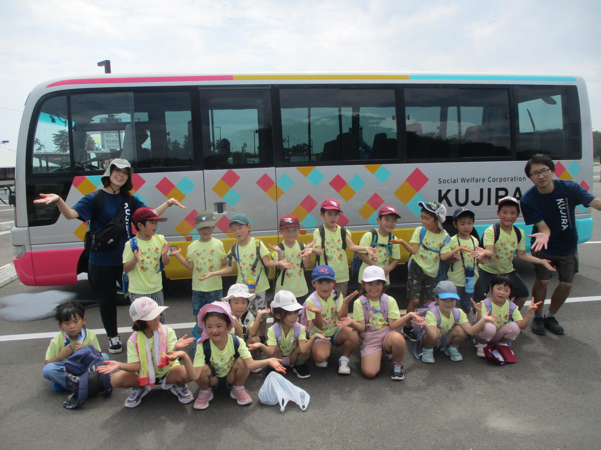 初めて見るくじらバスには、子どもたちが着ているくじらT シャツと同じマークが!