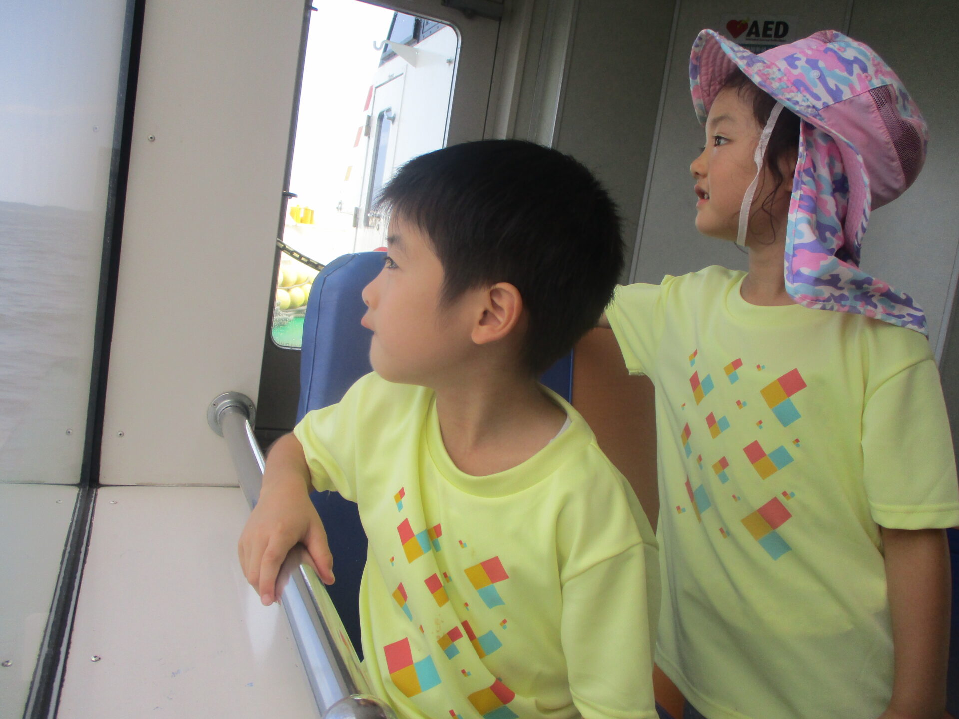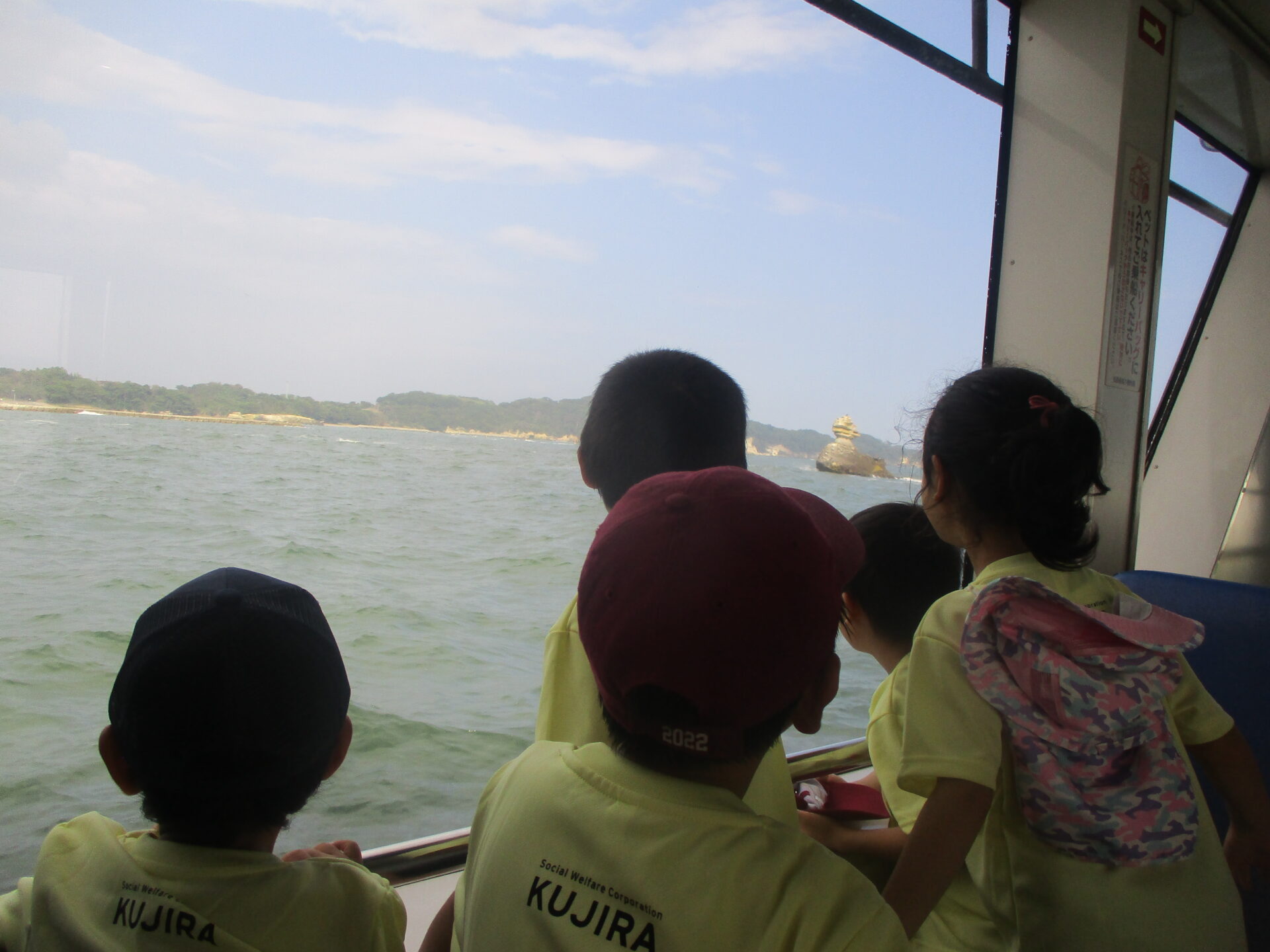 船の中では、アナウンスが流れていますが、子どもたちは目の前の波や島、海鳥に夢中になっています。