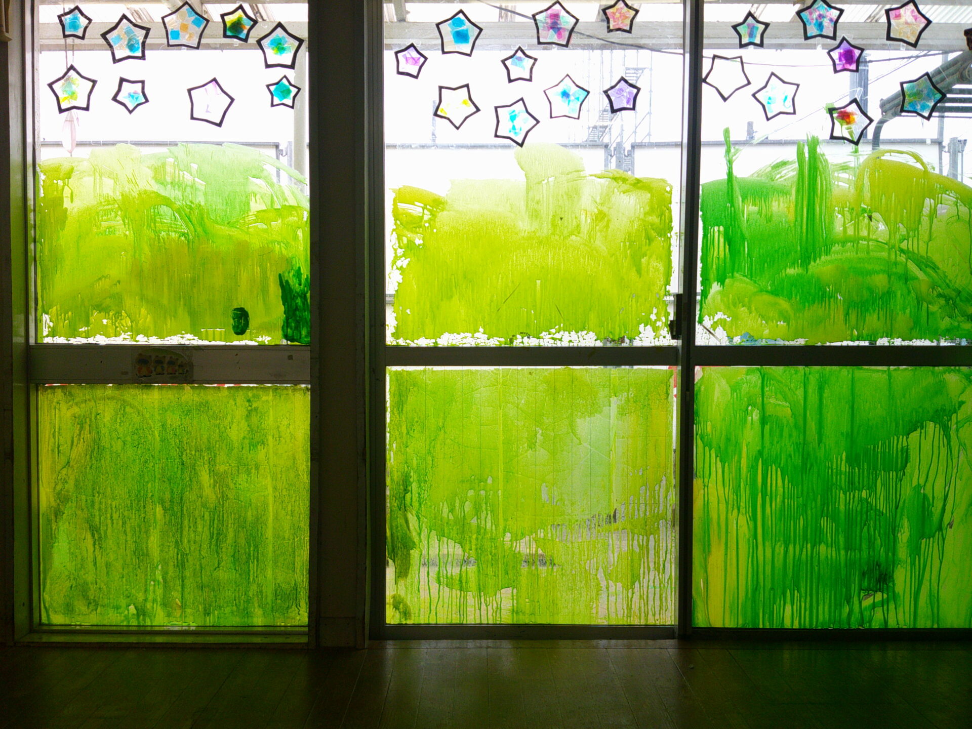 みんなで色づけした窓ガラスは光が入ると、さらにお部屋が明るくなりました。
