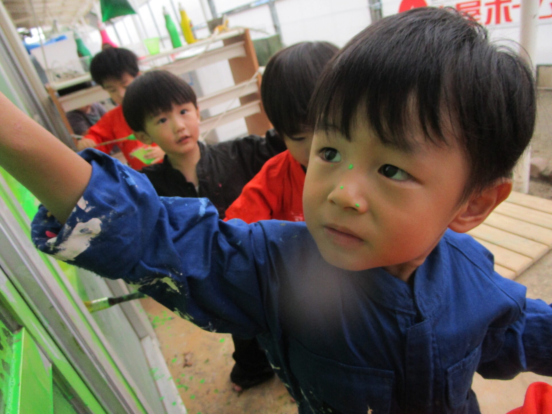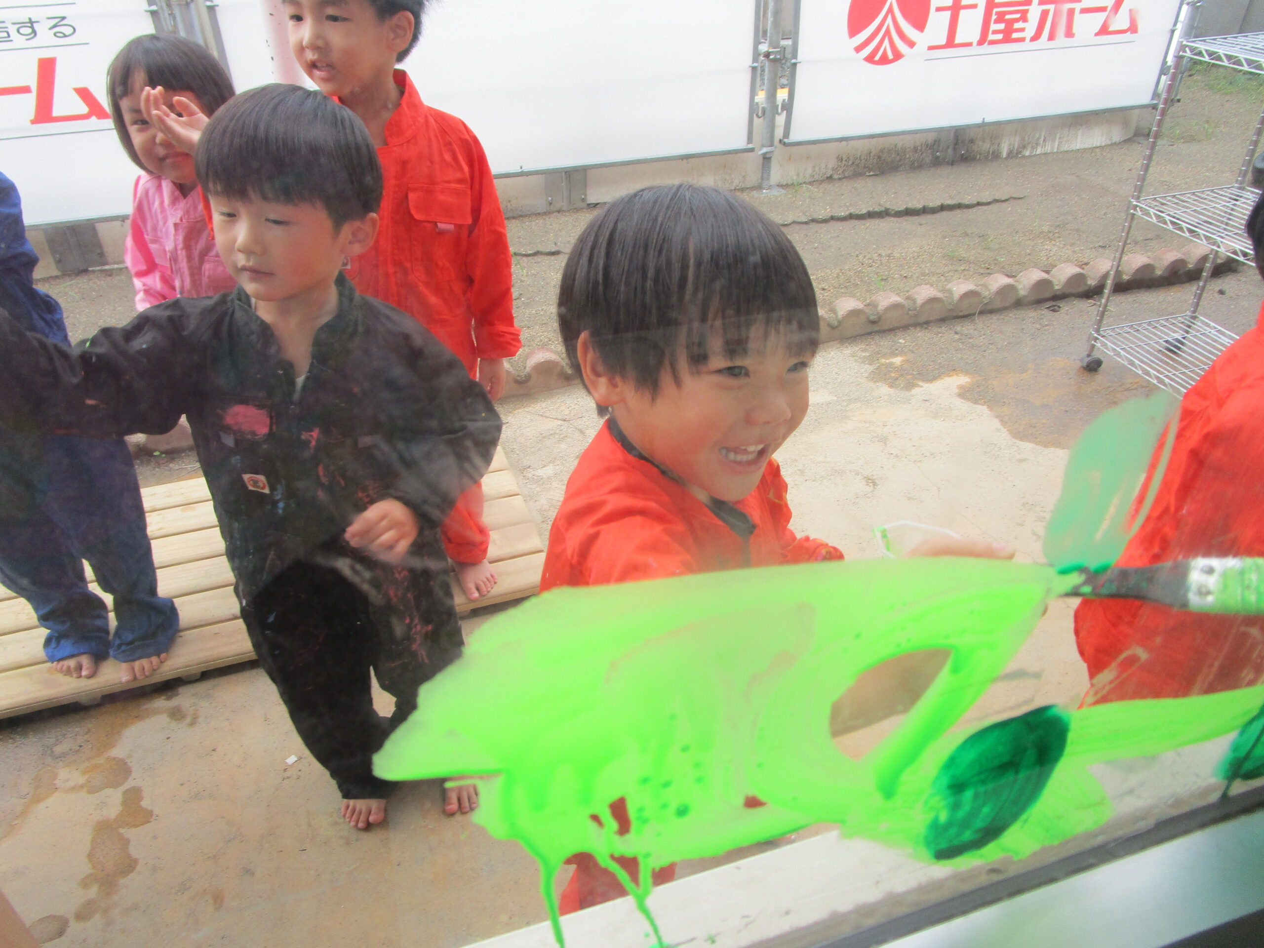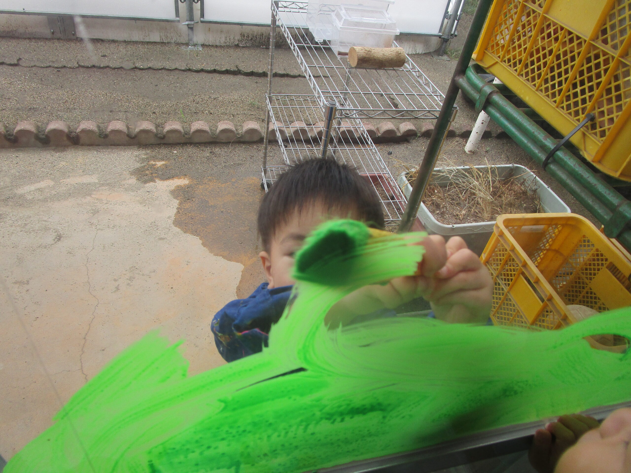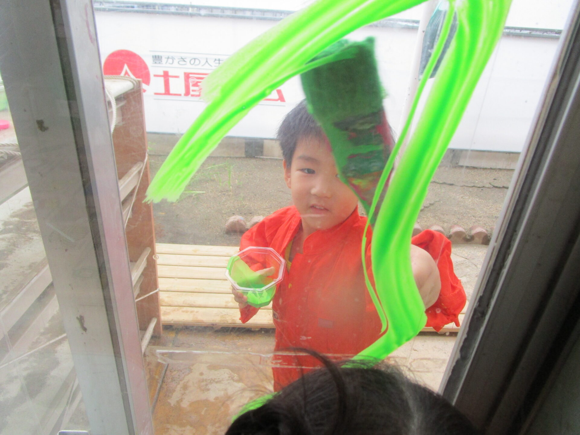 3歳児クラスは大好きな絵の具遊びを窓ガラスに行う様子を室内から撮影しました。