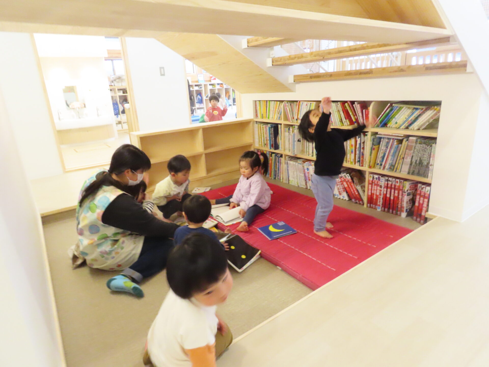 2階建ての新園舎の階段の下には、絵本コーナーがあります。