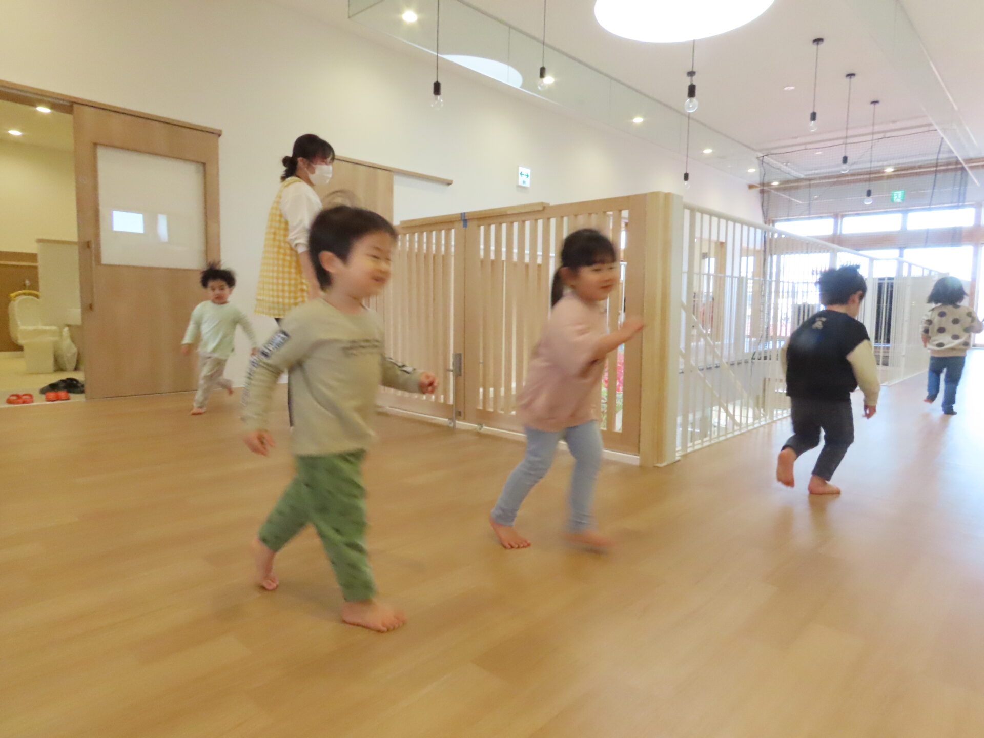 広いスペースをひとりが回り始めると、3歳児のこどもたちは次々に回り始め、ぐるぐると何周も回ることを楽しんでいました。