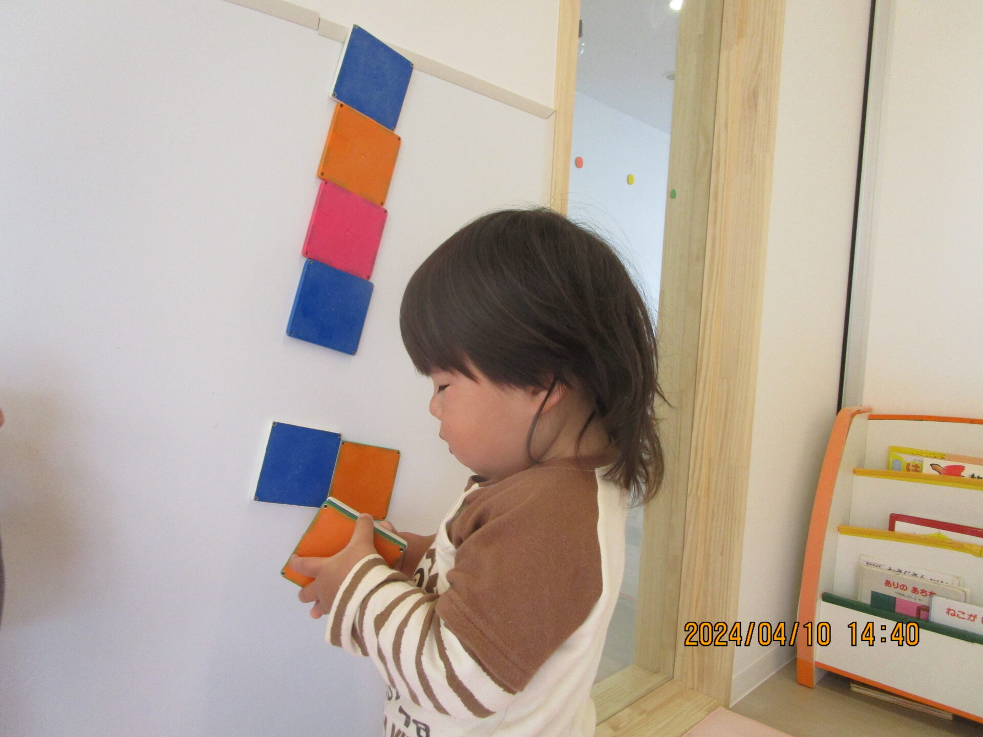 こどもたちの手の届く場所にマグネット玩具を貼り付けて遊べる壁面は、こどもたちのお気に入りの場所のひとつです。