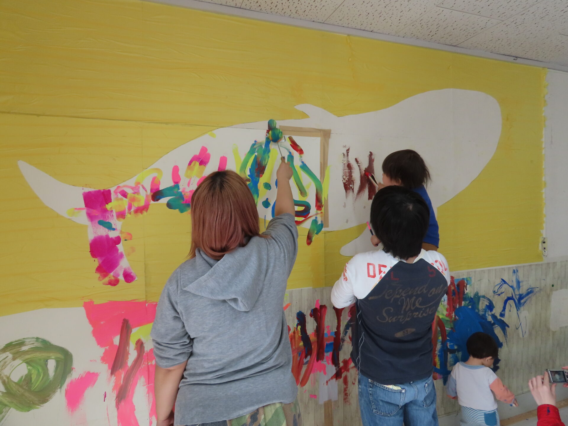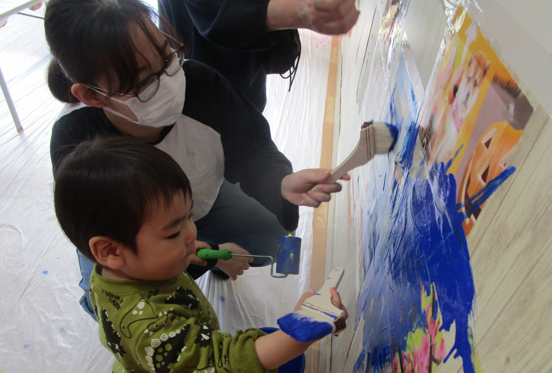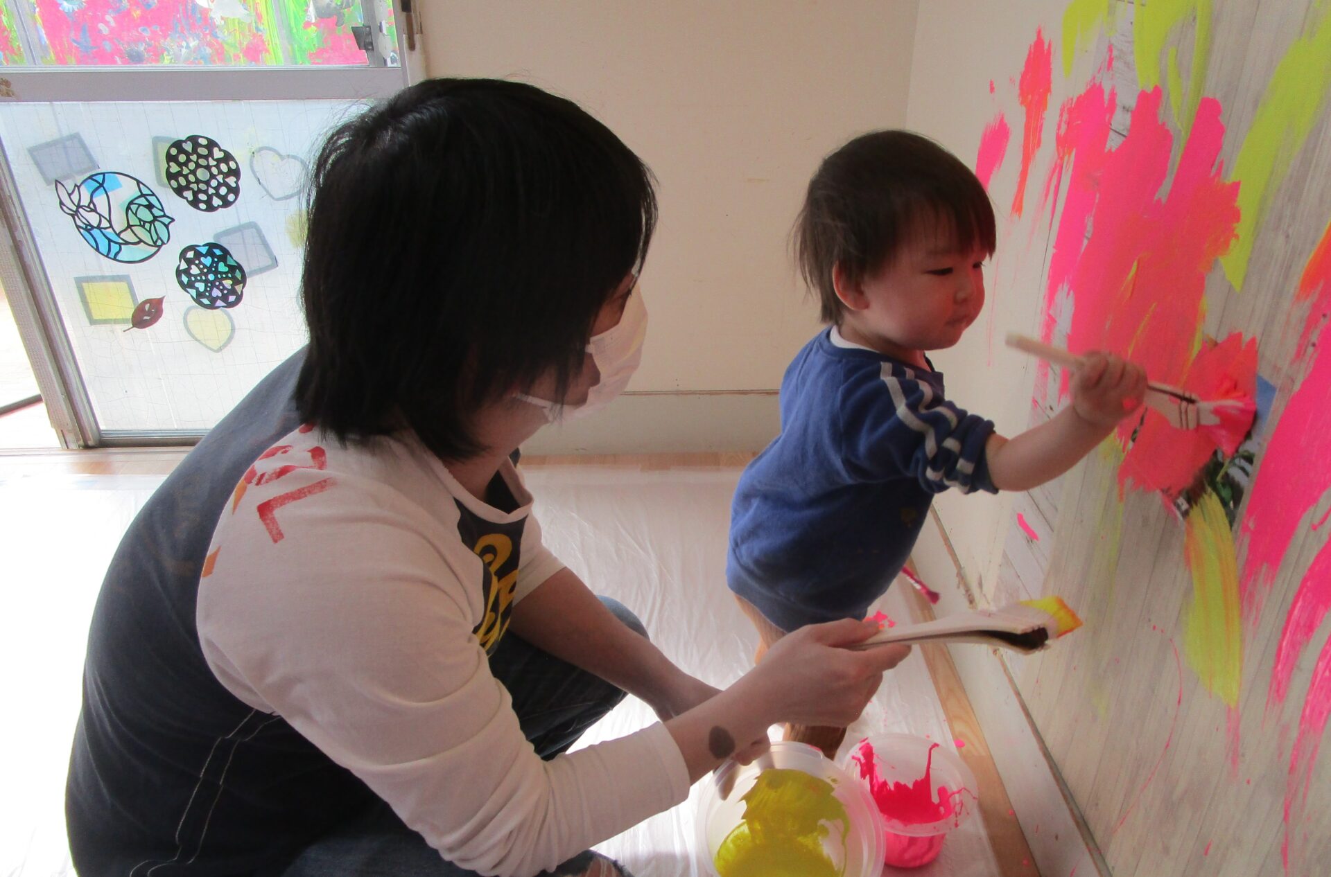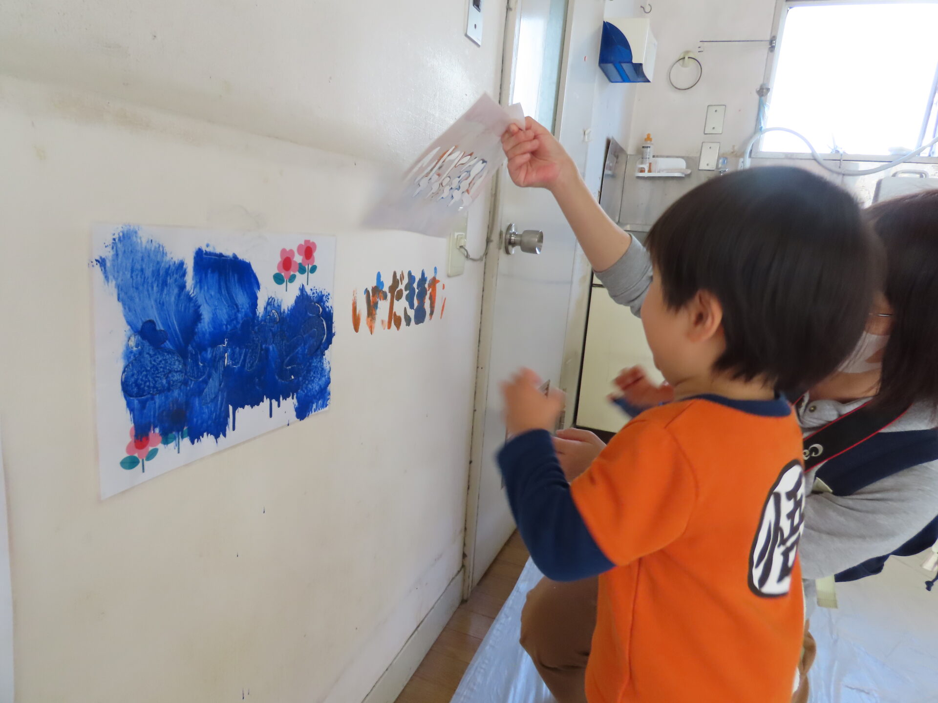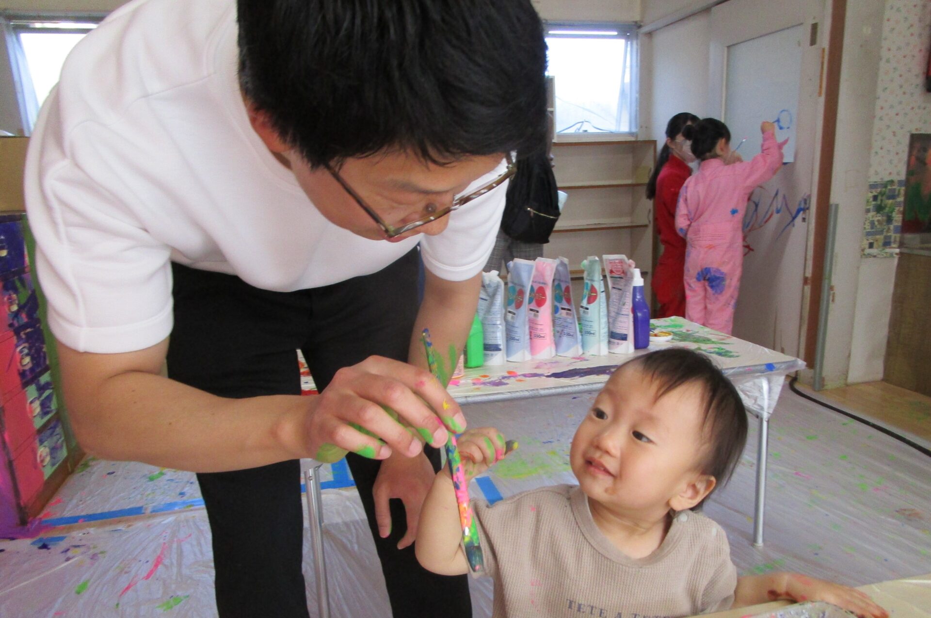4月入園のご家庭にも参加いただき、家族で一緒に「くじら」ならではの色遊びを楽しんでいる様子はこちらです。