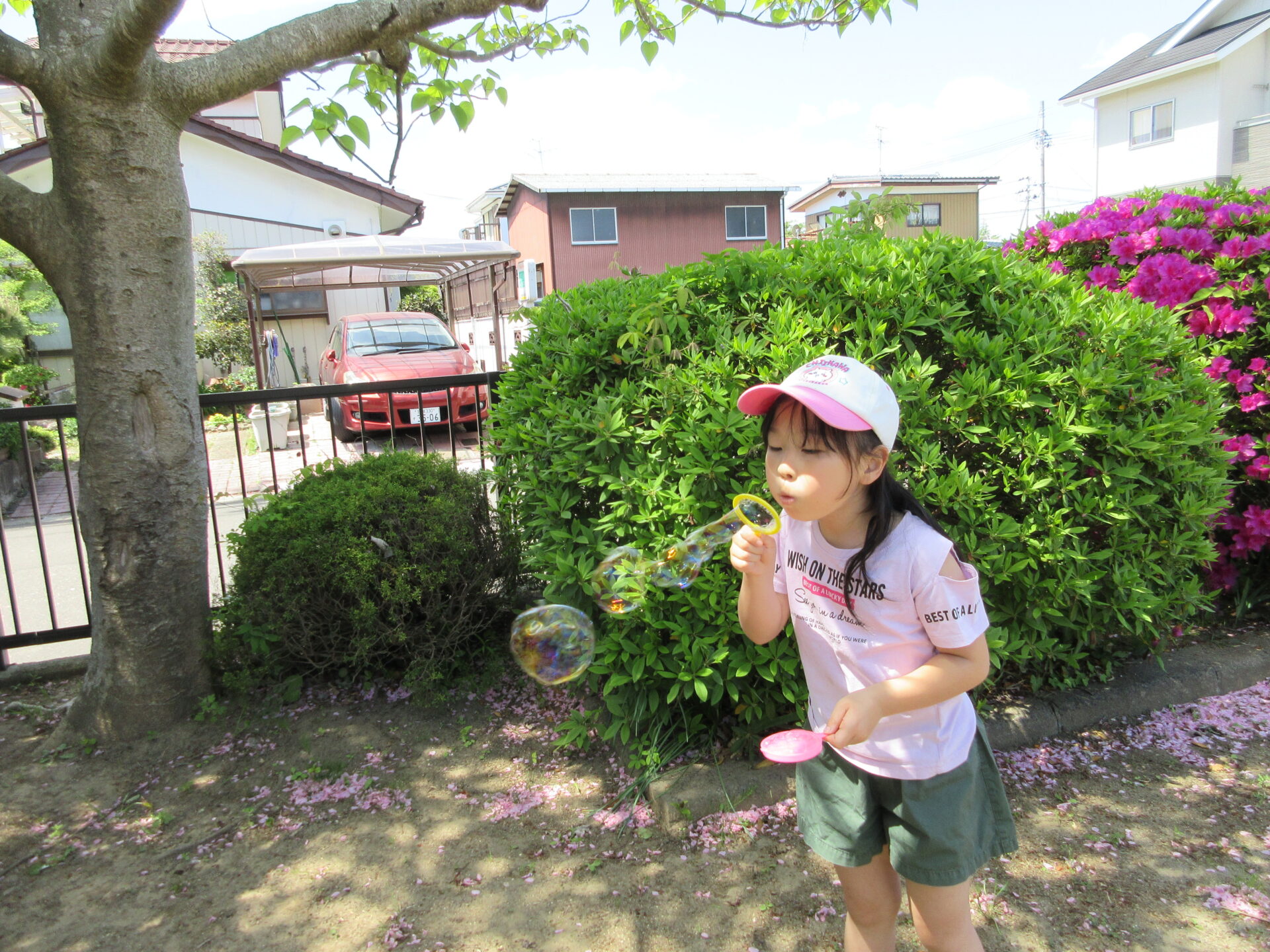 早く吹いて、小さなシャボン玉がたくさん風に舞う様子を楽しんだり、そーっと吹いて大きなシャボン玉づくりに挑戦したり、思い思いに楽しみました。