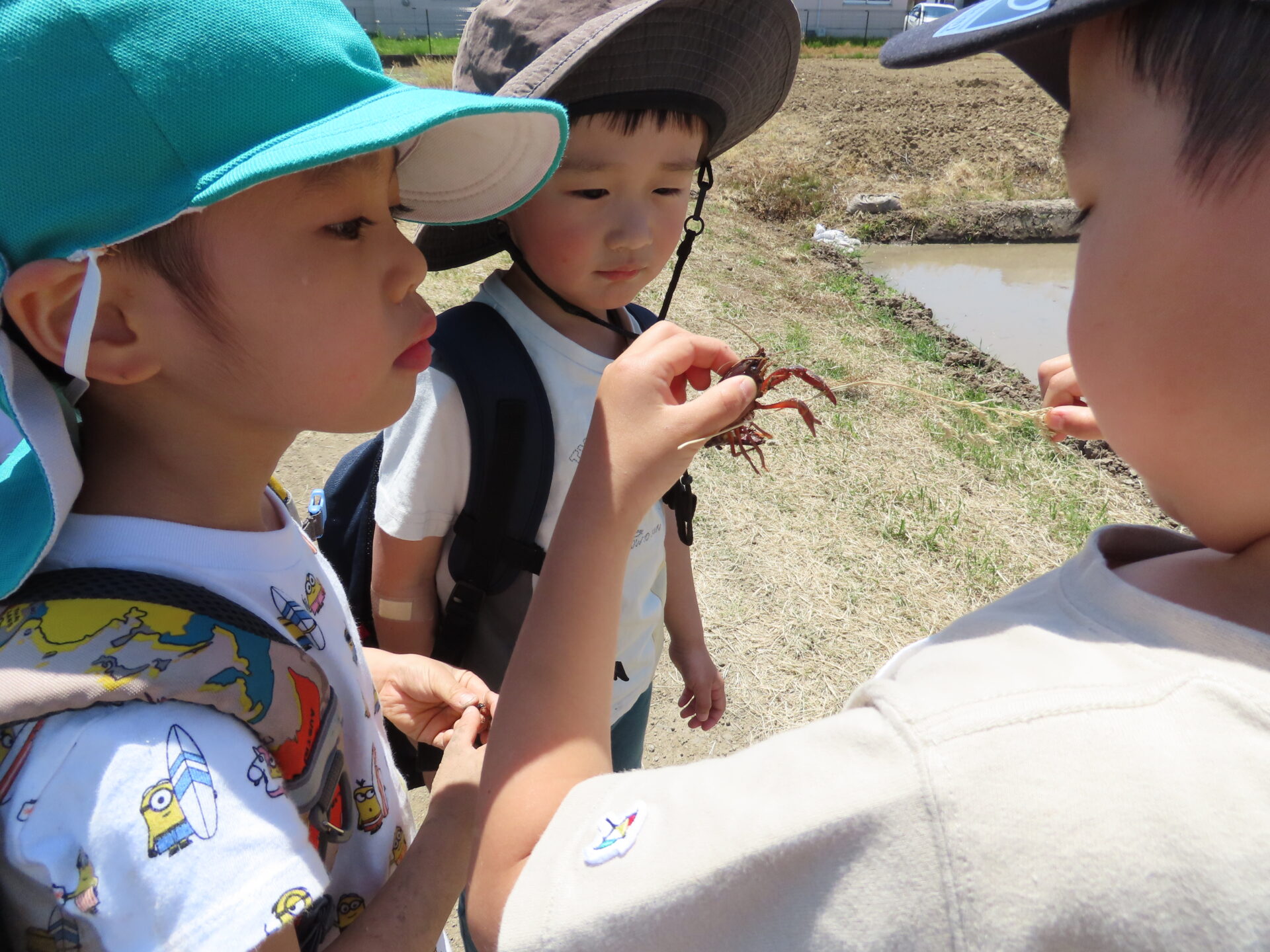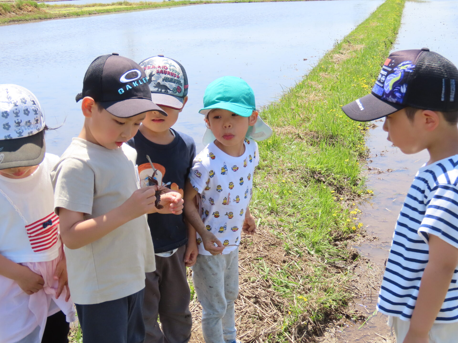 先日、田んぼ観察に出かけた5歳児のこどもたちは、ザリガニやカエルがたくさんいたことも楽しみになり、「また、行きたい!」「今度は、いつ行く?」など、田んぼへ出かけることを話し合っていました。