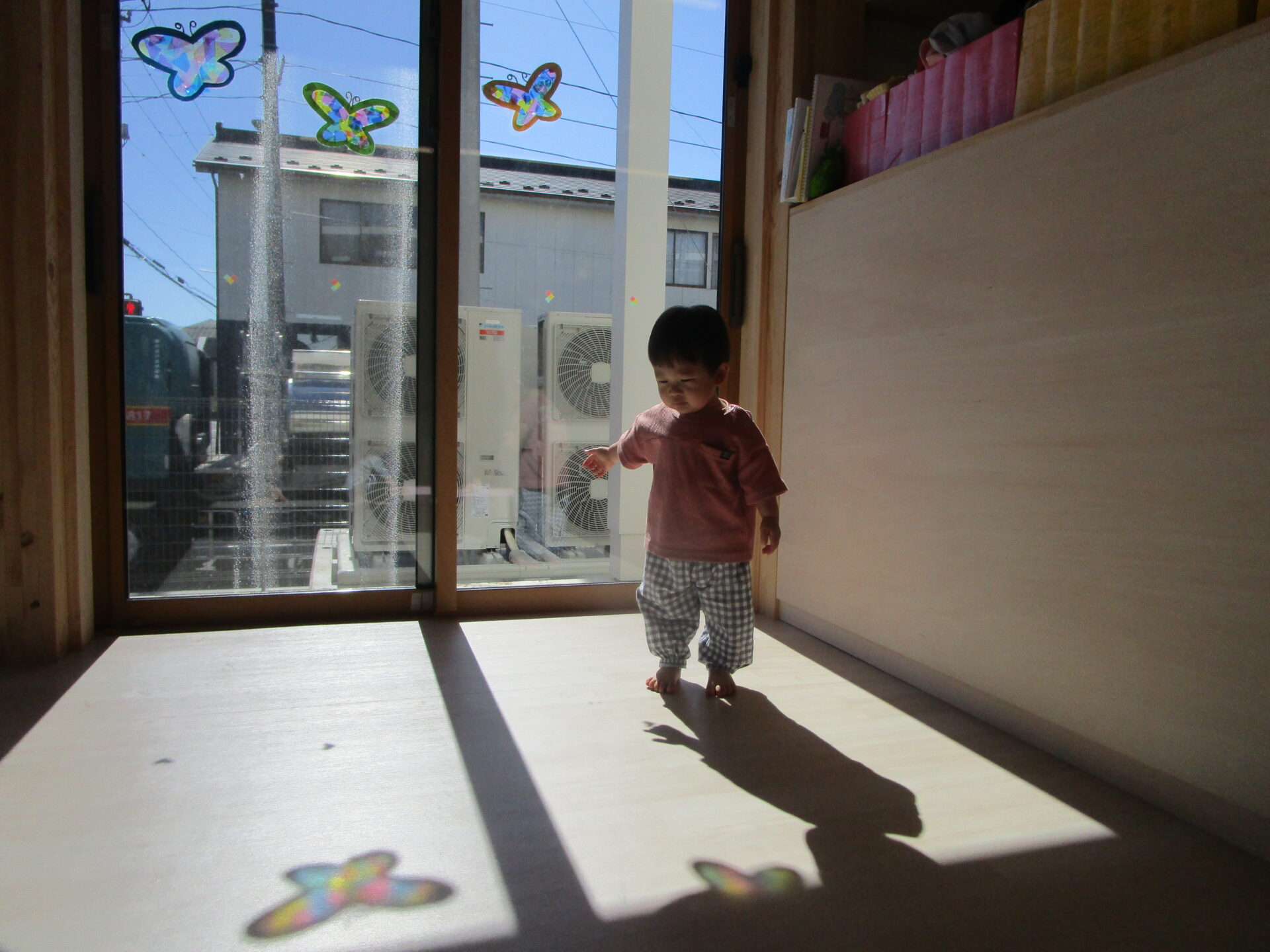 光を使って、こどもたちと楽しめたらと、キラキラ素材のちょうちょを飾ったところ・・・