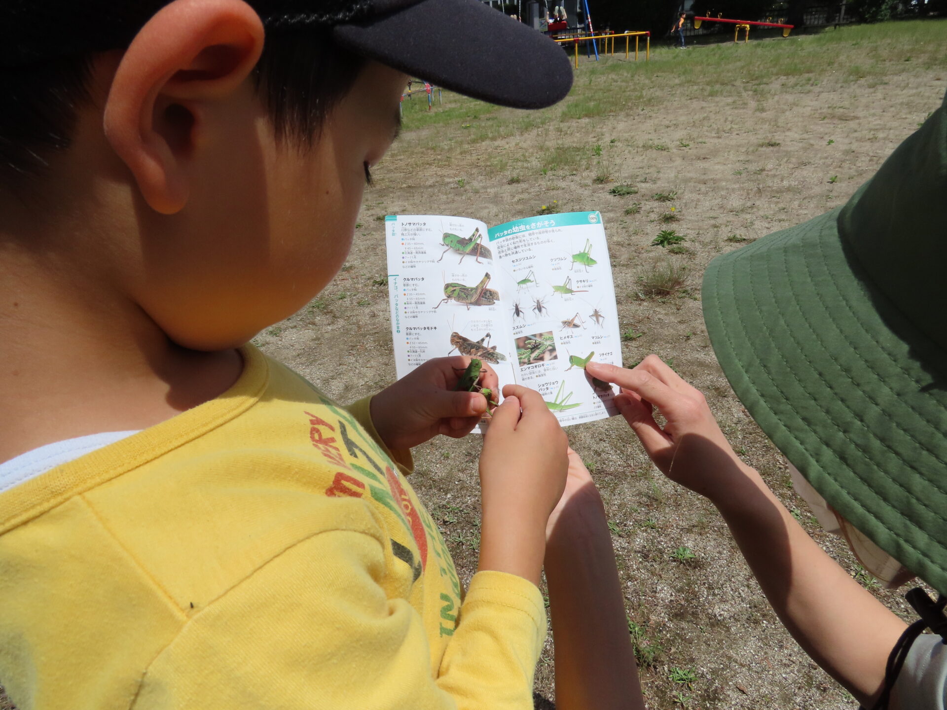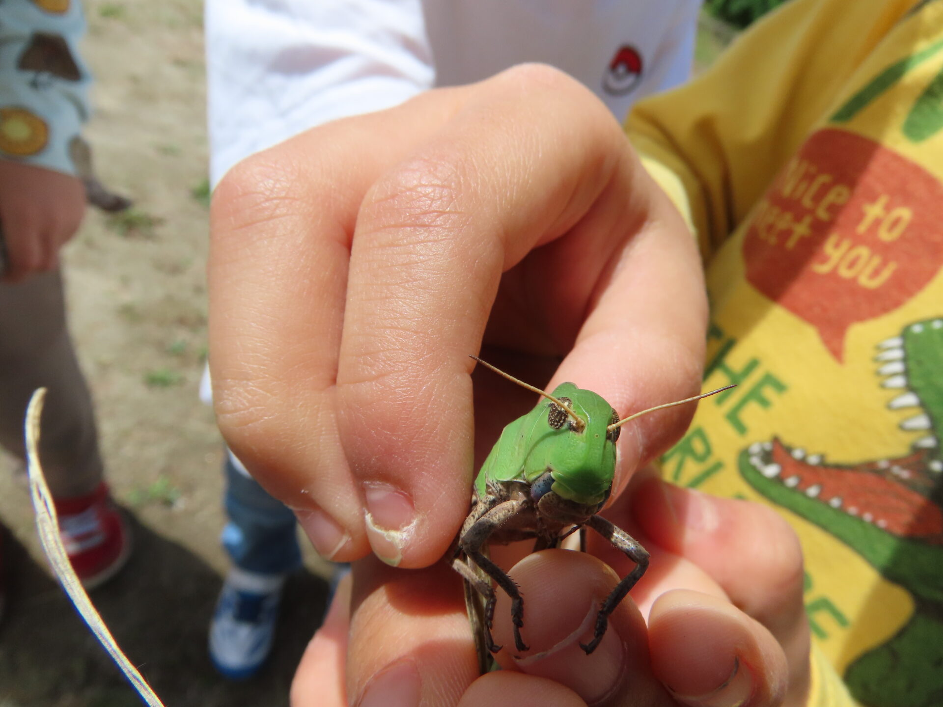 見たことのない形のバッタで「なにバッタかな?」と、疑問に思い始めたこどもたち。