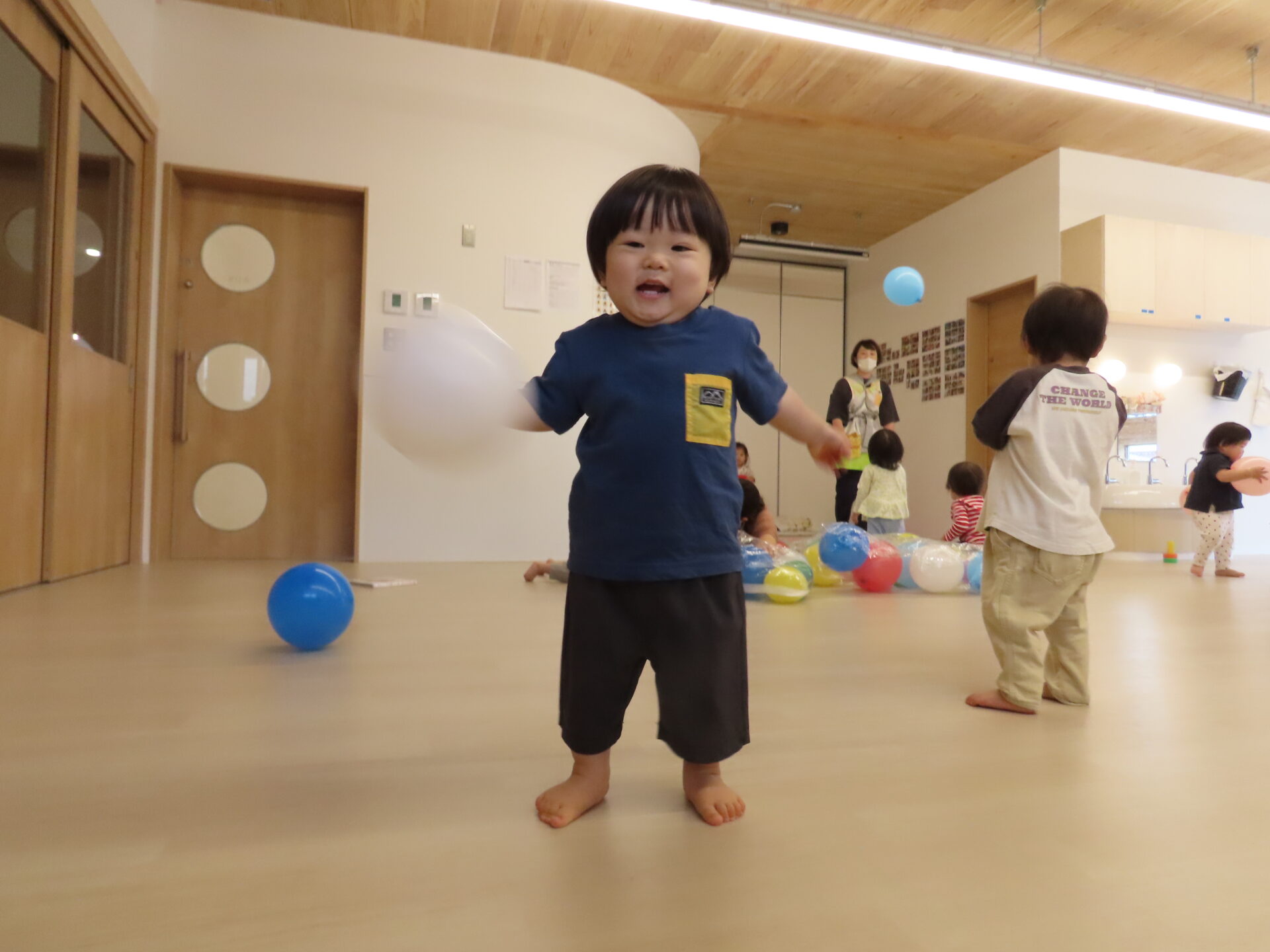 手に持った風船を左右に大きく振ってニッコリ笑顔!