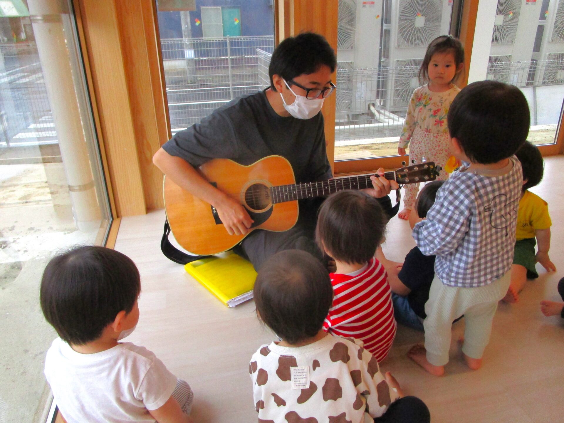 思いきり身体を動かした後、保育者が歌い始めると次々にこどもたちが集まってきて、一緒に歌遊びを楽しみました。