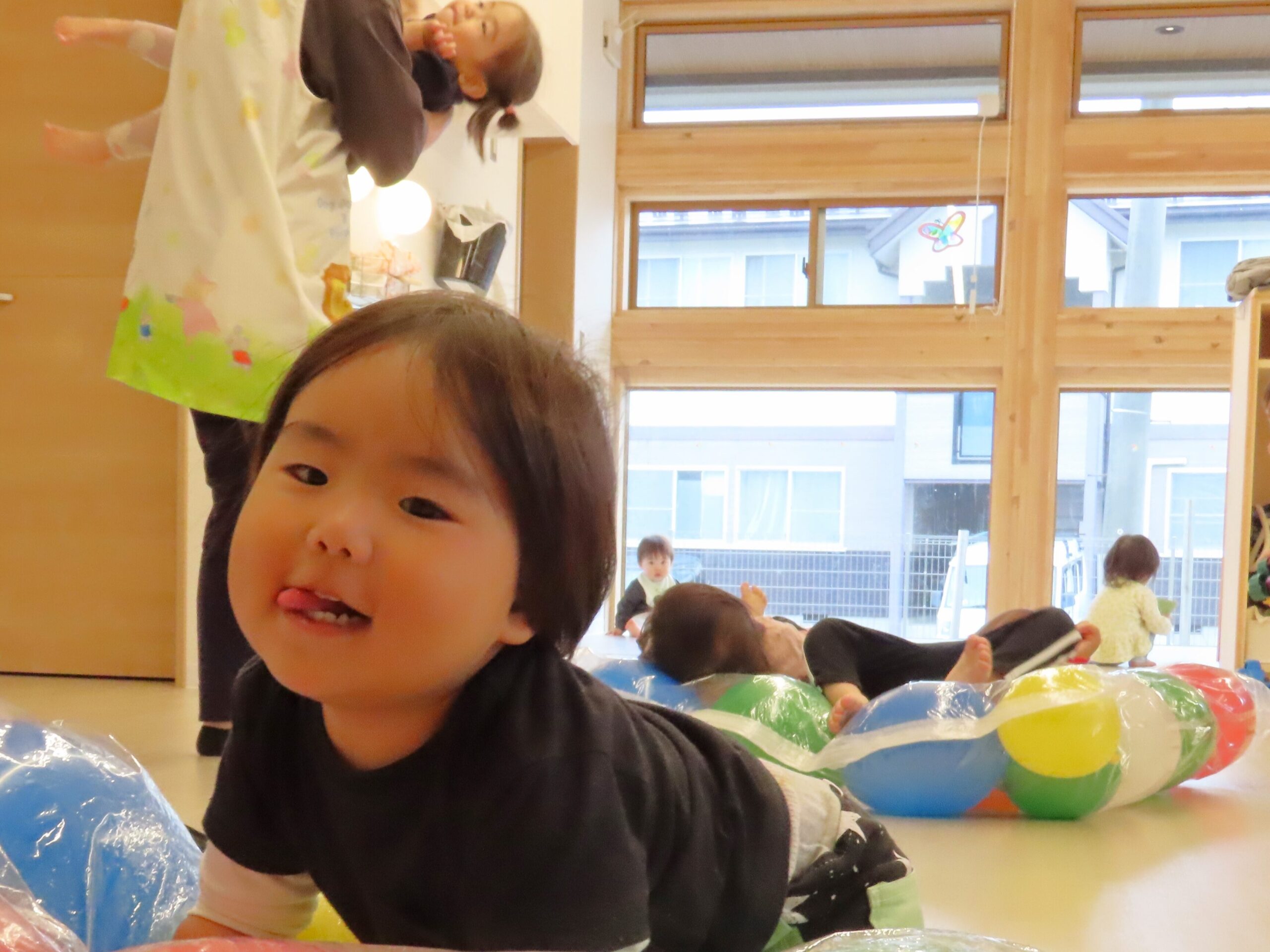 雨の日でも、のびのびと身体を動かして遊べるよう、風船マットを準備しました。