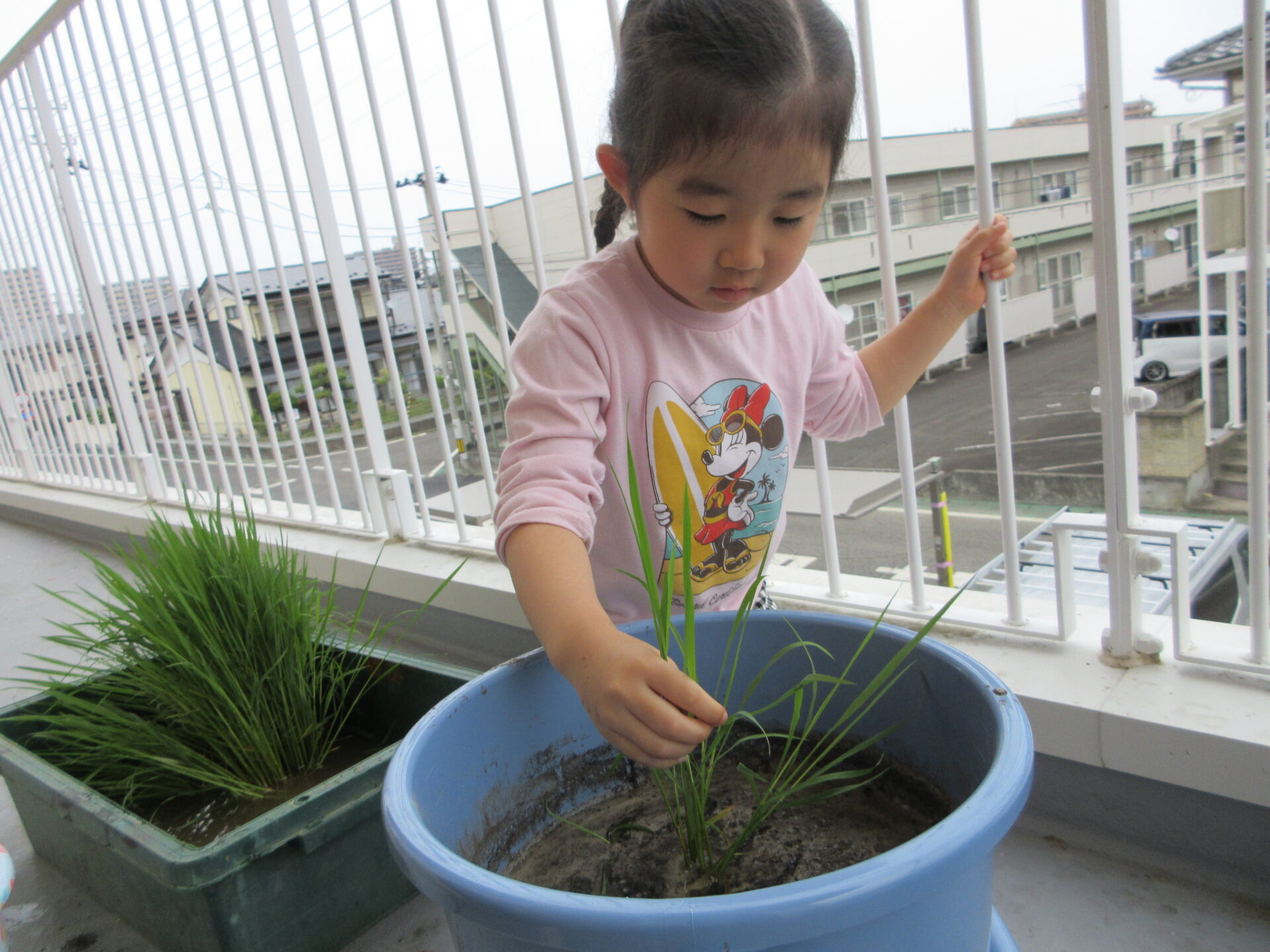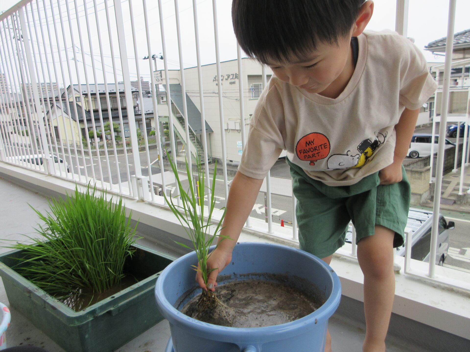 そのベランダを使って、4歳児のこどもたちがバケツで稲を育て始めました。